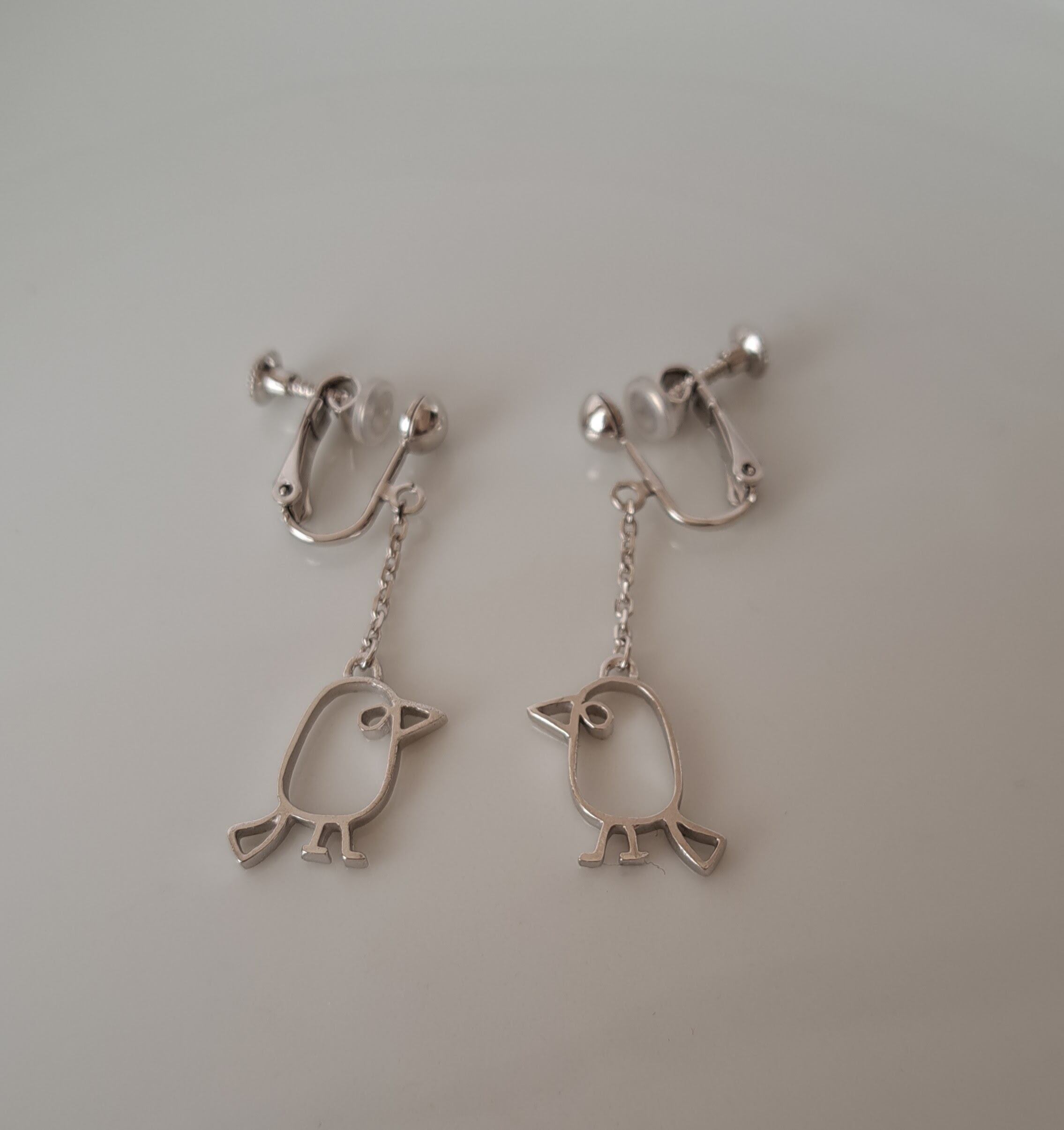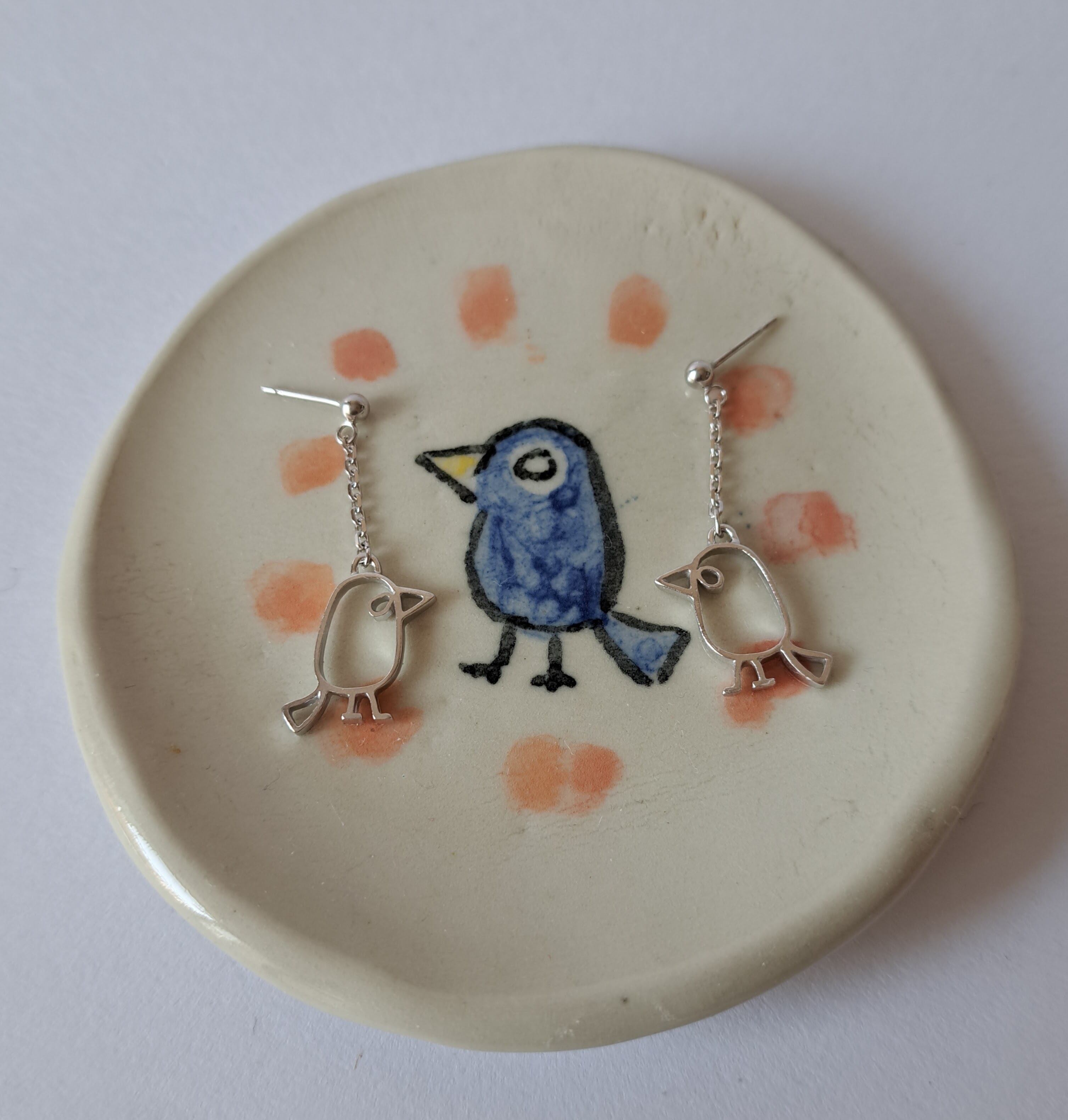 父の陶芸で描かれた素朴な「幸せの青い鳥」をモチーフにしたイヤリングで、