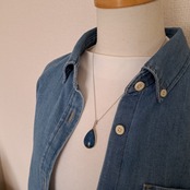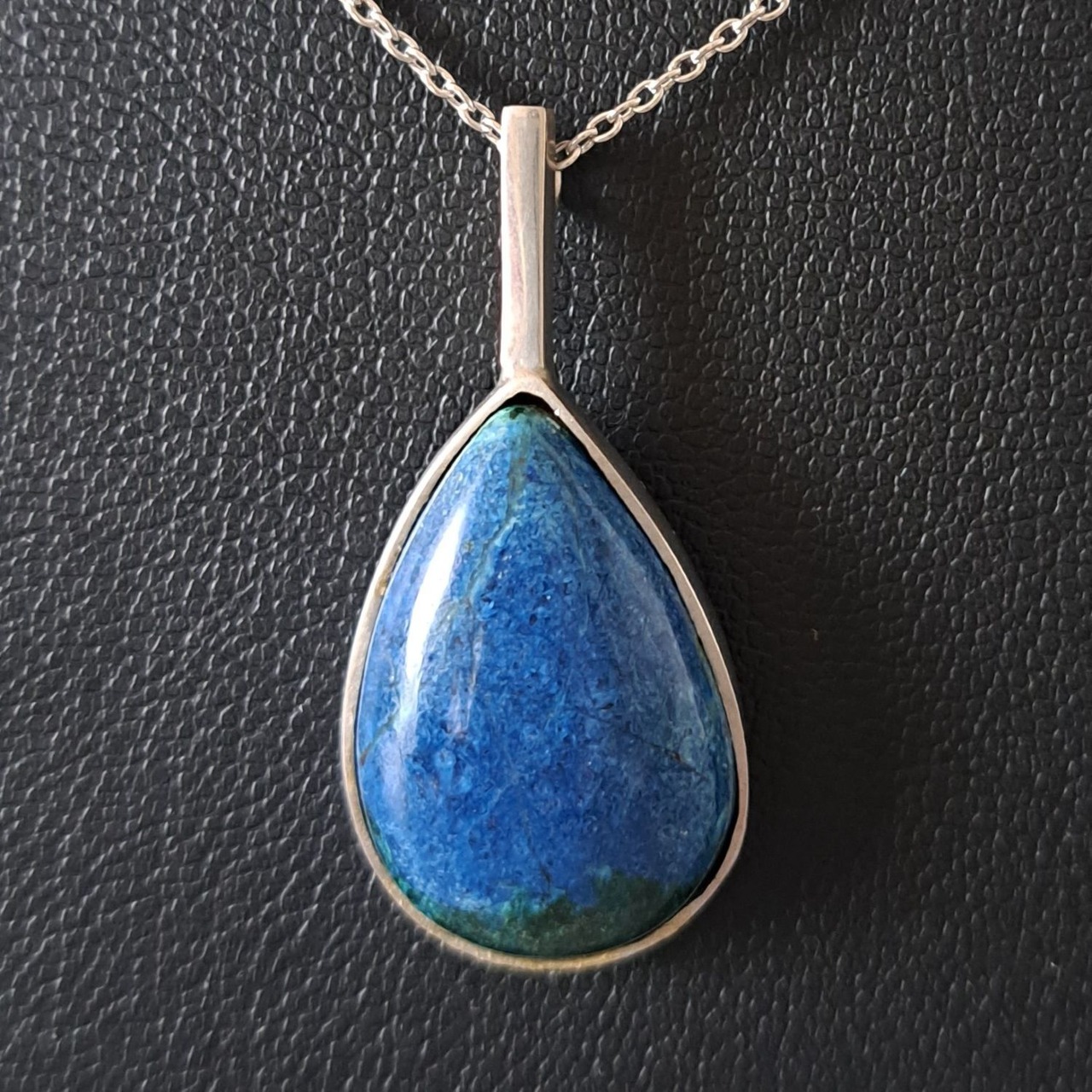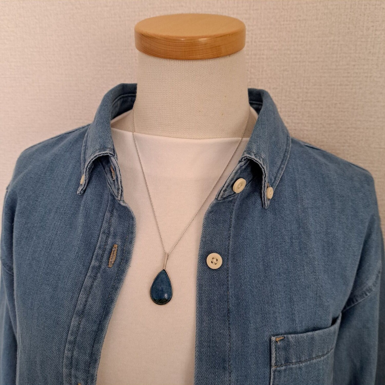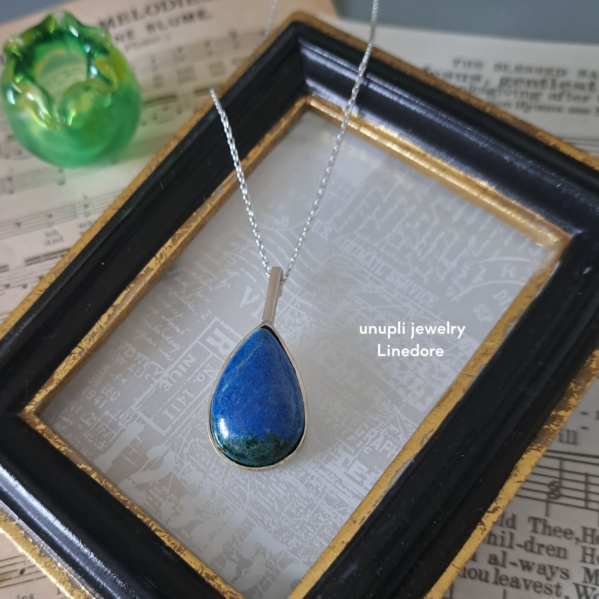 鮮やかなブルーの空と穏やかなグリーンの田園が調和した、クリソコラのペンダント。ぷっくりとした卵型をほんの少しシャープにした天然石が、自然の力強さと静けさを感じさせ、ぶれない安定感を象徴するデザインです。色鮮やかでありながら、少し黒みがかった落ち着きのあるブルーとグリーンは、大地の年輪のように、時間と共に深みを増す美しさを持っています。心に安らぎを与え、自然の力を身近に感じるひとときを、きっとご自身の中で見つけていただけることでしょう。