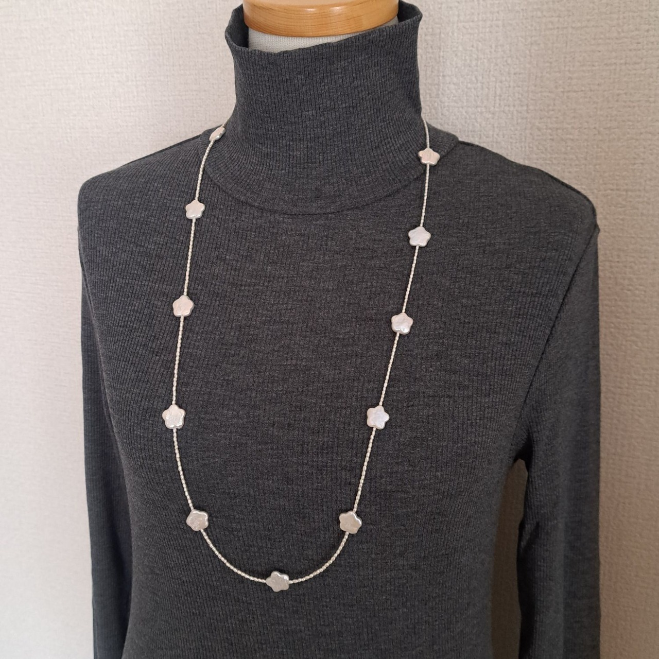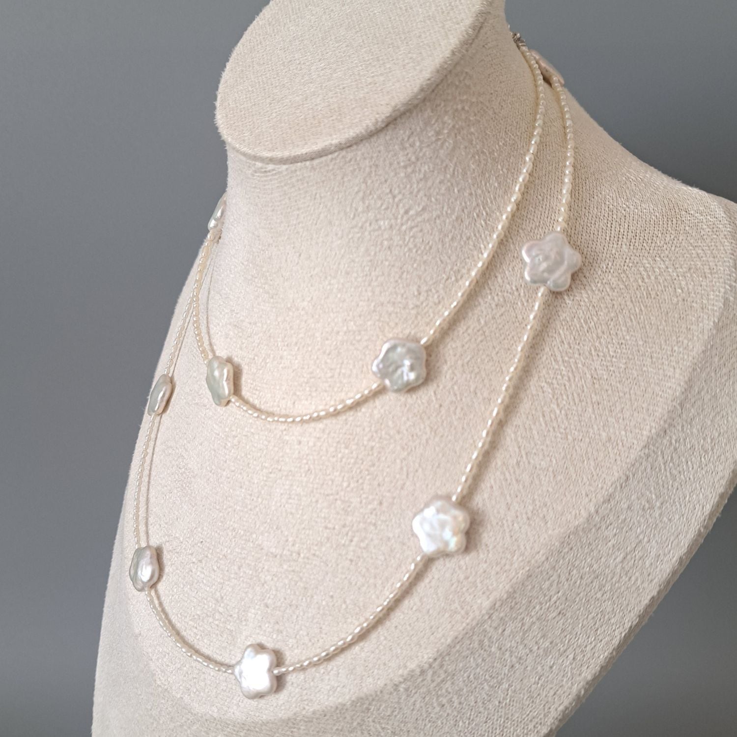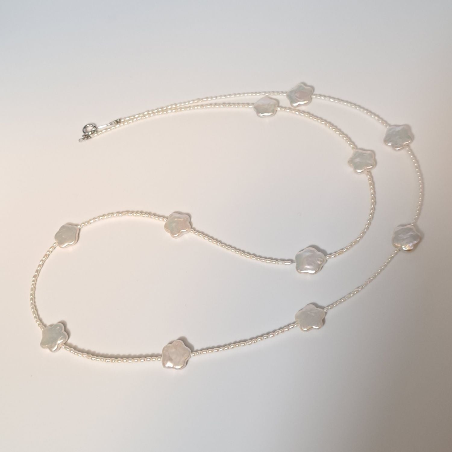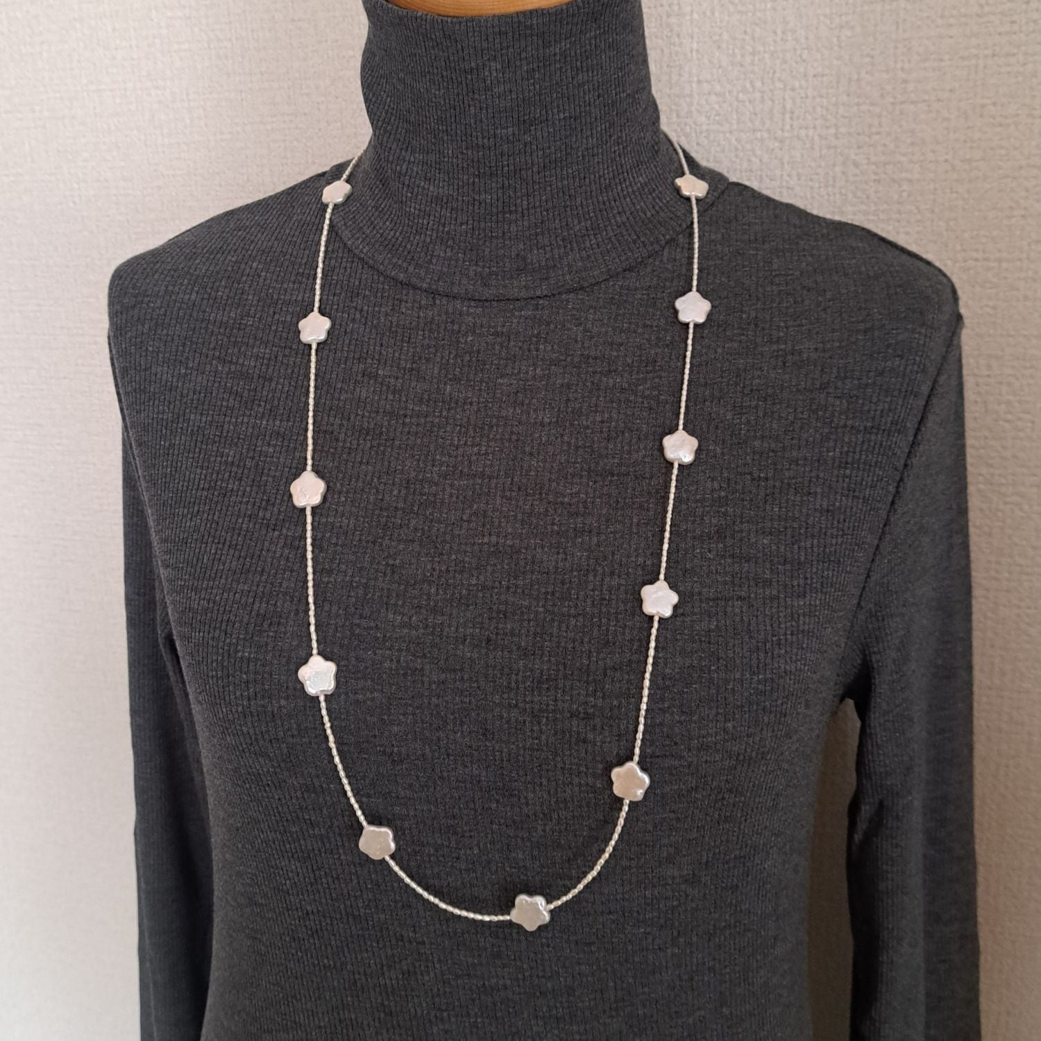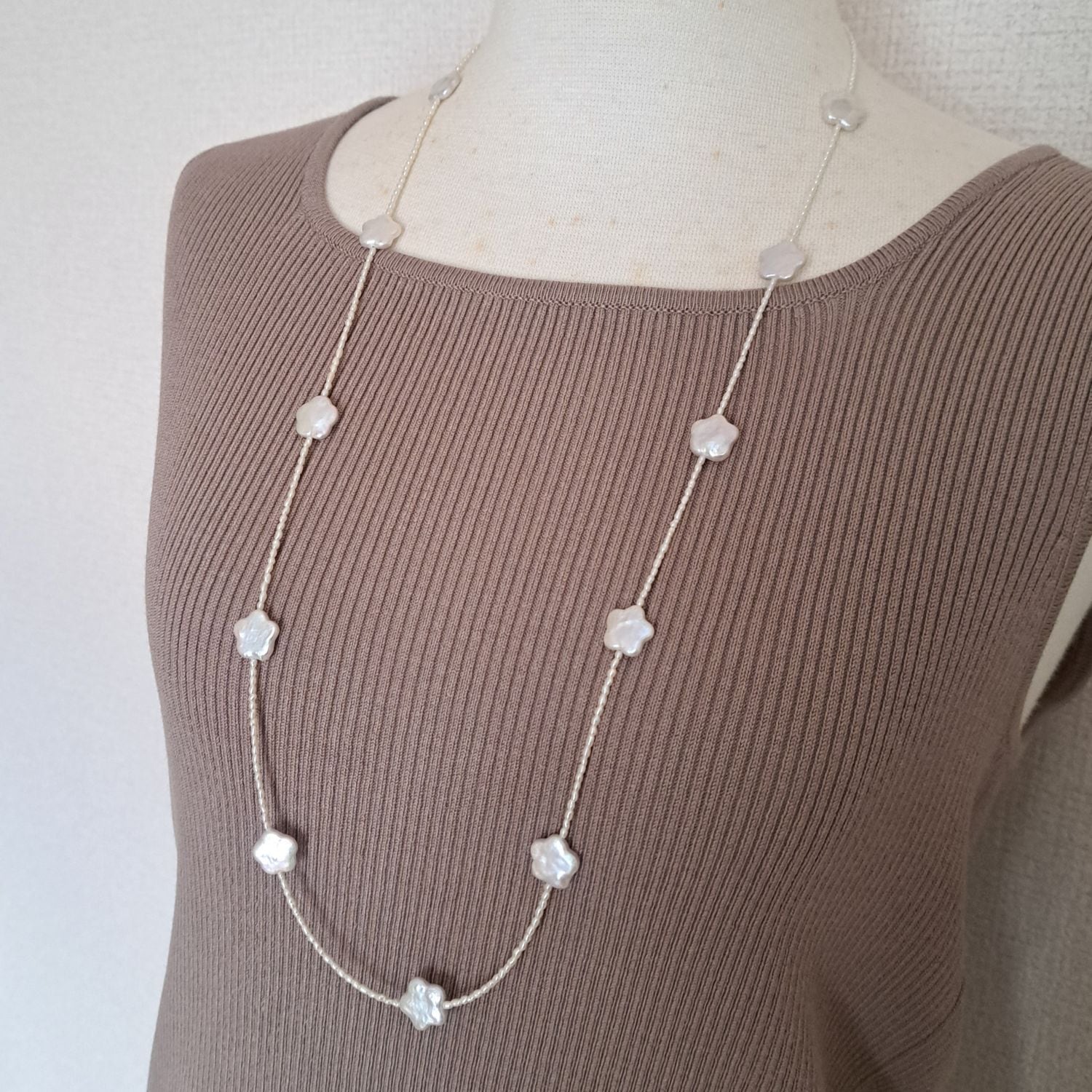 花があるだけで、その場が和む――小さな淡水パールの間に、可愛い花の形の淡水パールを11輪咲かせたロングネックレス。