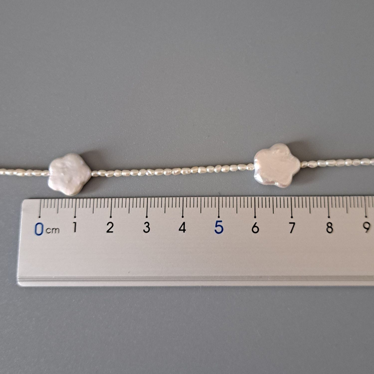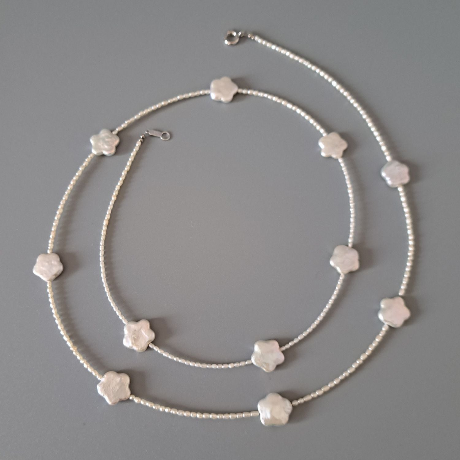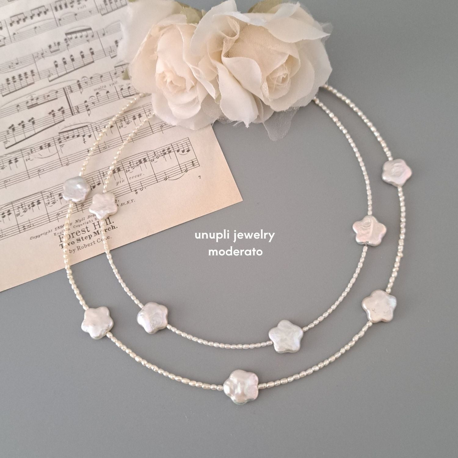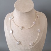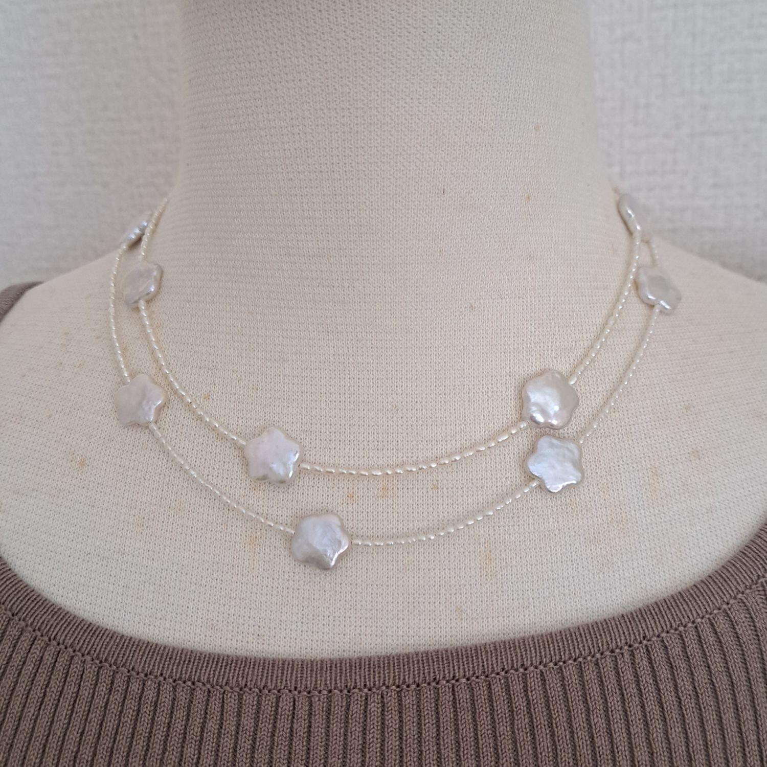花があるだけで、その場が和む――小さな淡水パールの間に、可愛い花の形の淡水パールを11輪咲かせたロングネックレス。