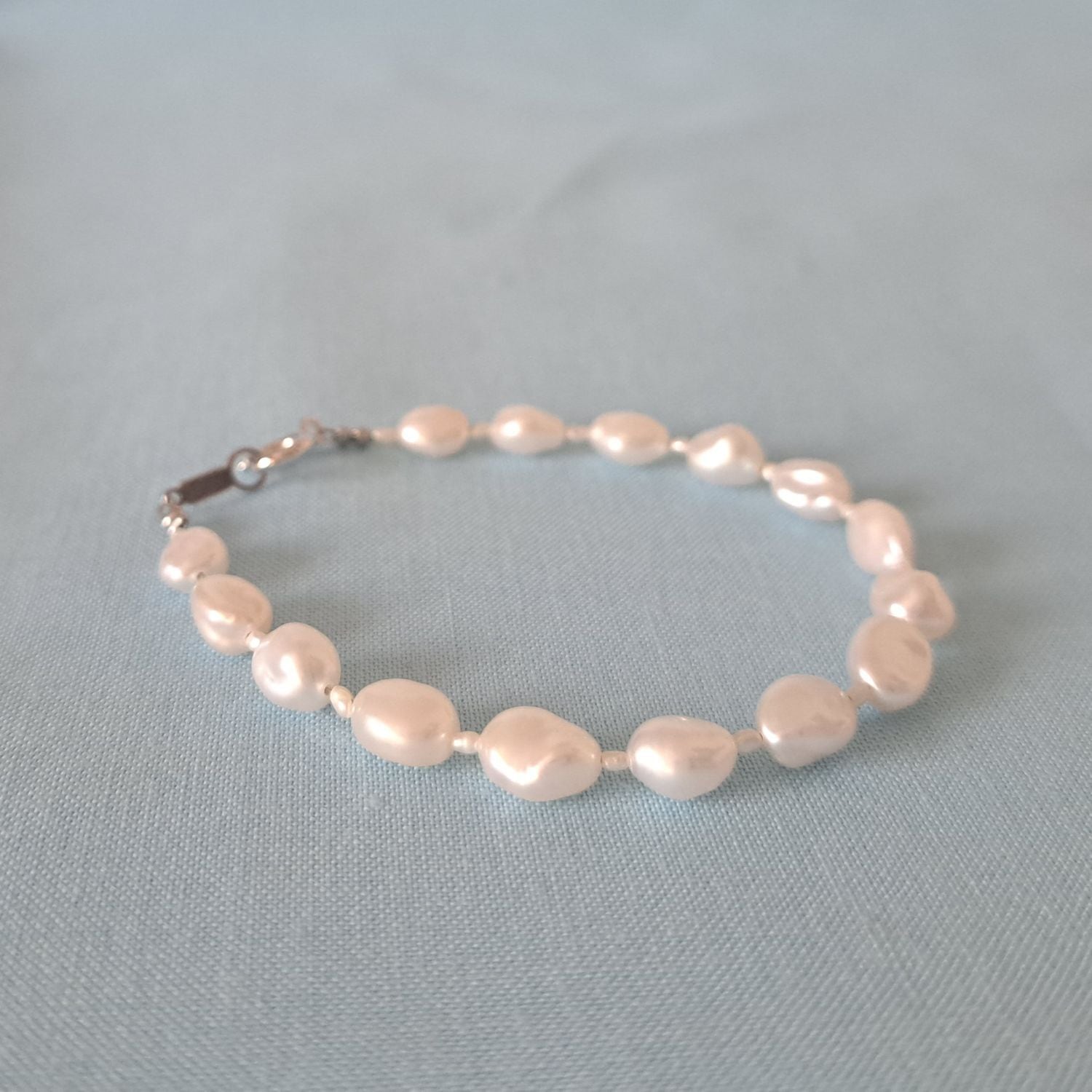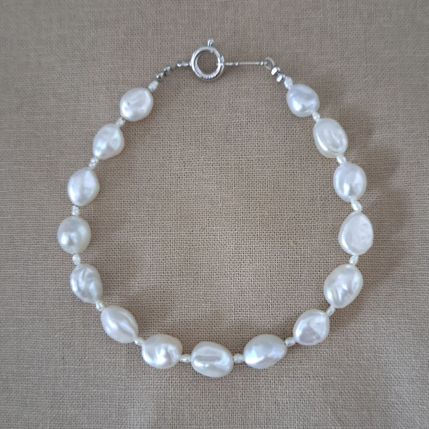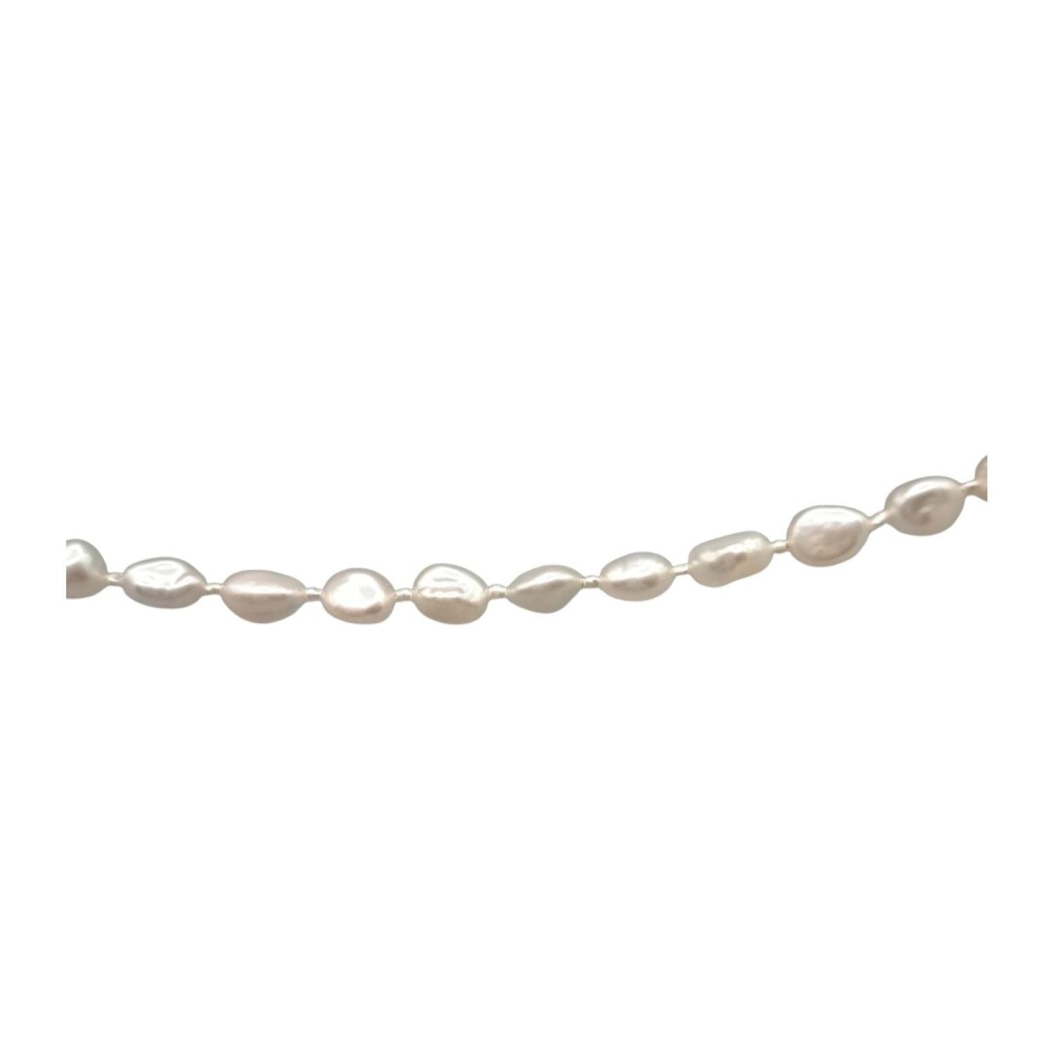 淡水パールの少し歪んだ形が一つ一つの個性を引き立て、まるで自然の芸術のようです。その真っ白な表面は、光を受けるとほんのりとピンク、ブルー、グリーンに輝き、照りの美しさを放ちます。同じ形でも微妙に異なる表情が楽しめる淡水パールの間に、小さな米粒のような淡水パールを挟み込み、全体に繊細でありながら華やかな印象を与えます。その個性が魅力的なブレスレットです。