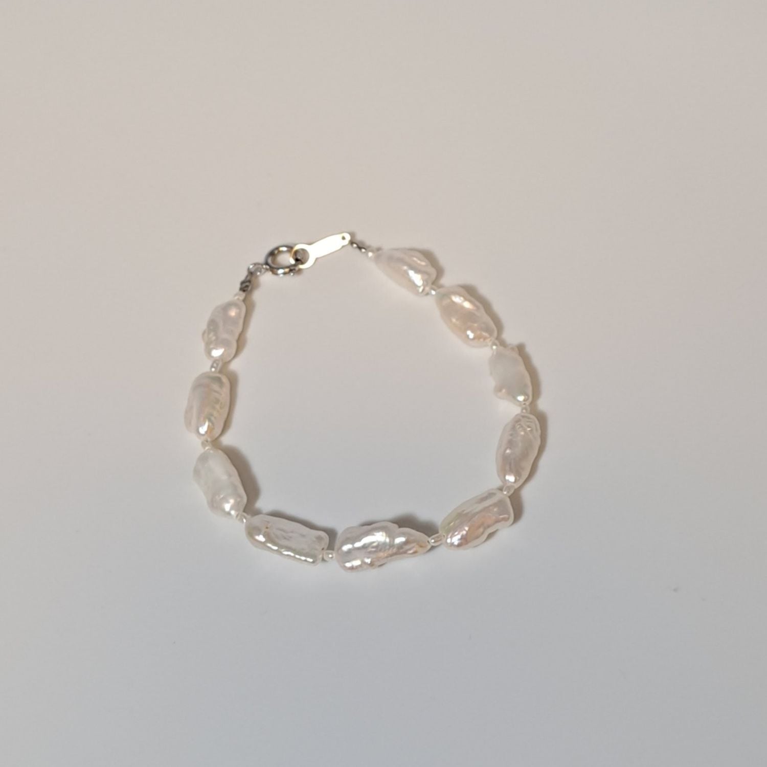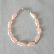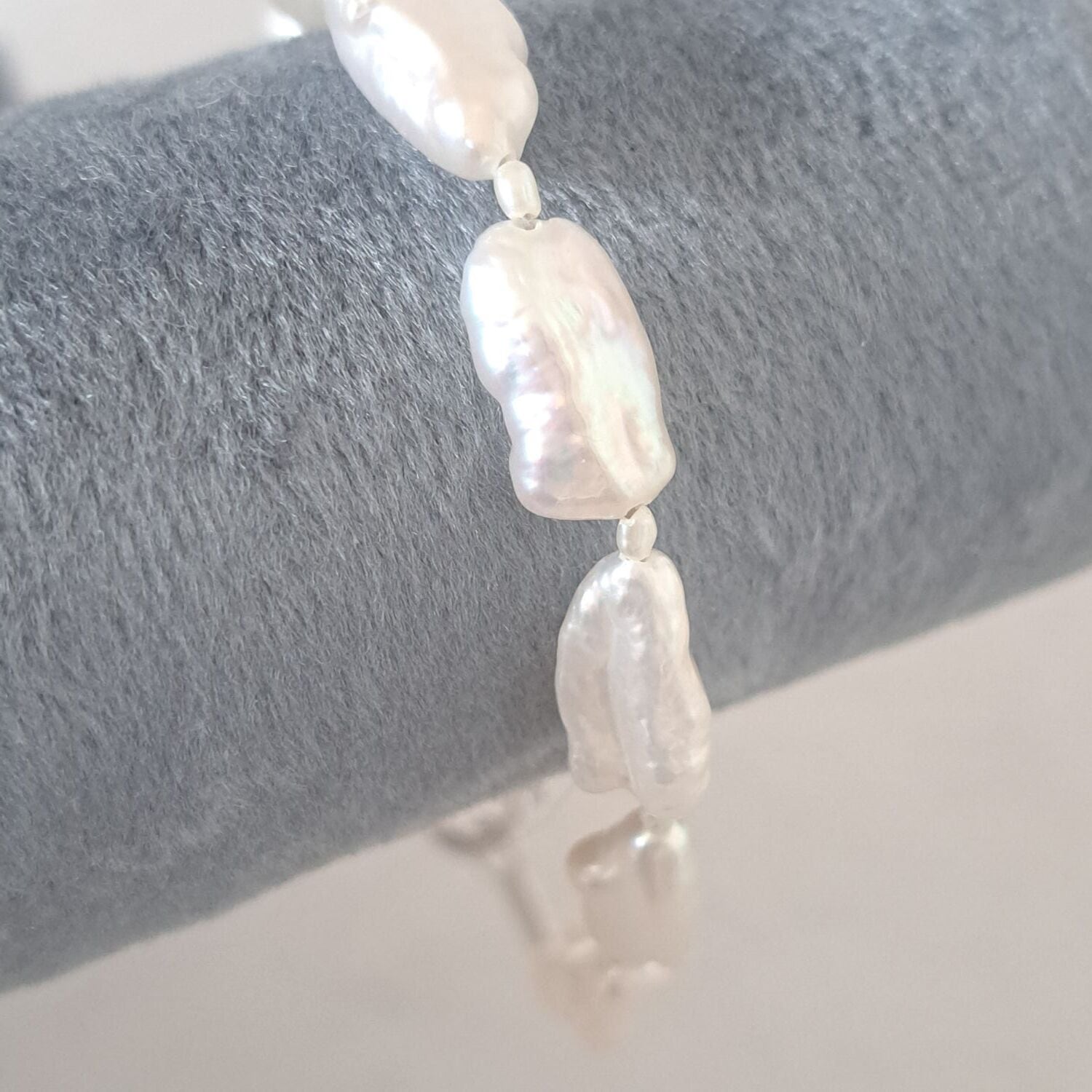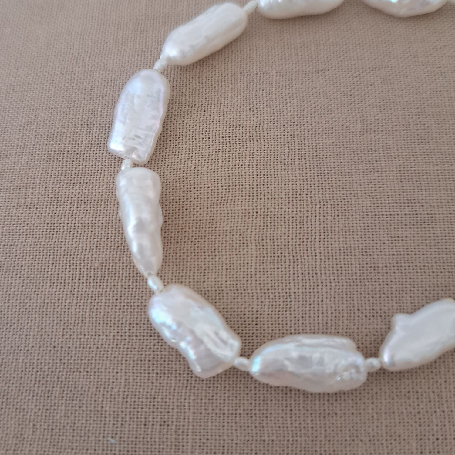 ひとつひとつ異なる形を持つ淡水パールは、まるで自然の中で出会った流木のよう。そのパールを丁寧に繋ぎ合わせ、間に小さな淡水パールを挟むことで、まるで海辺で見つけた小さな宝物がひとつずつ並んでいるかのようなデザインに仕上げました。それぞれのパールが、自然の息吹を感じさせる輝きを放ち、まるで特別な瞬間を閉じ込めたかのような魅力を持っています。