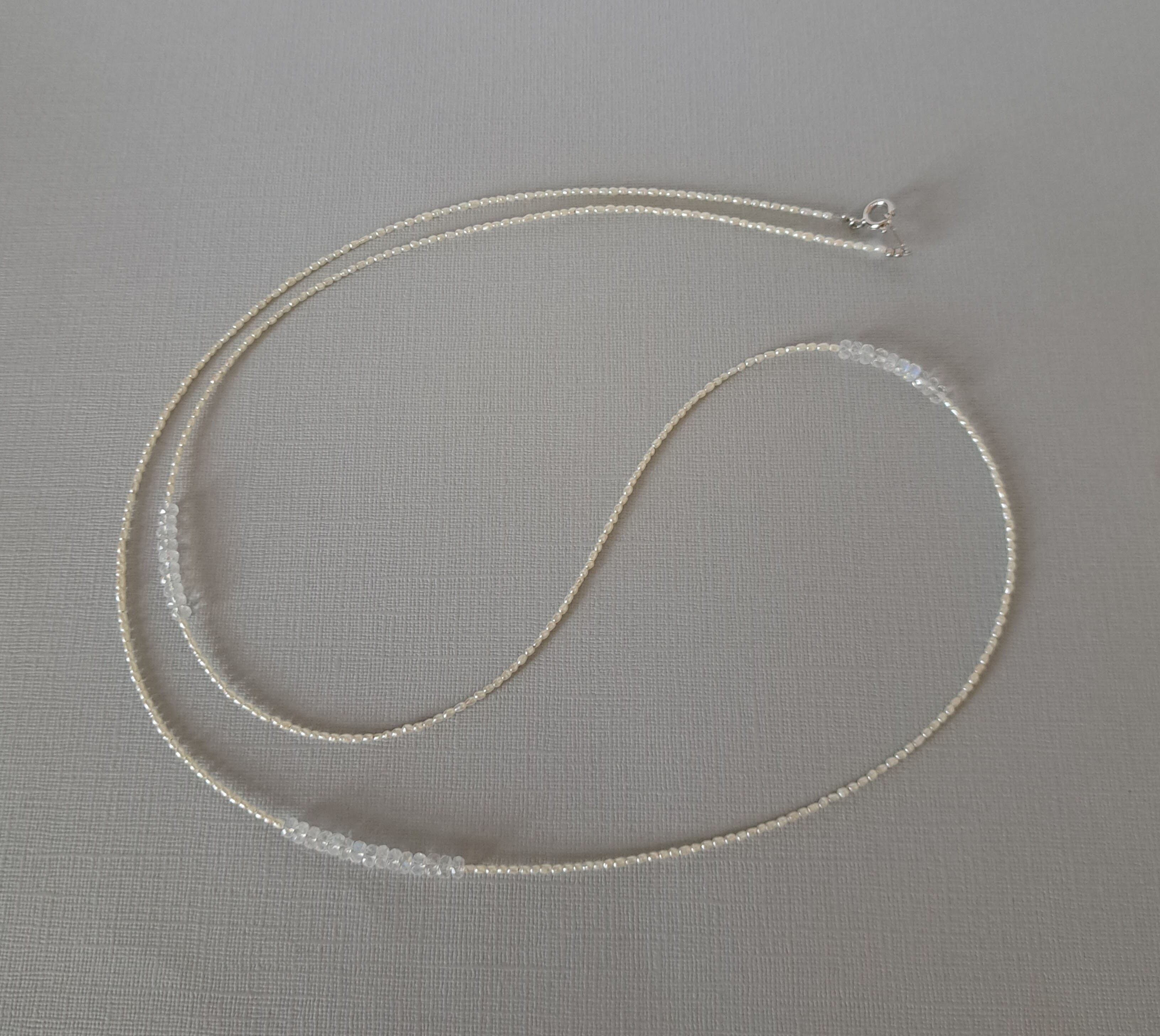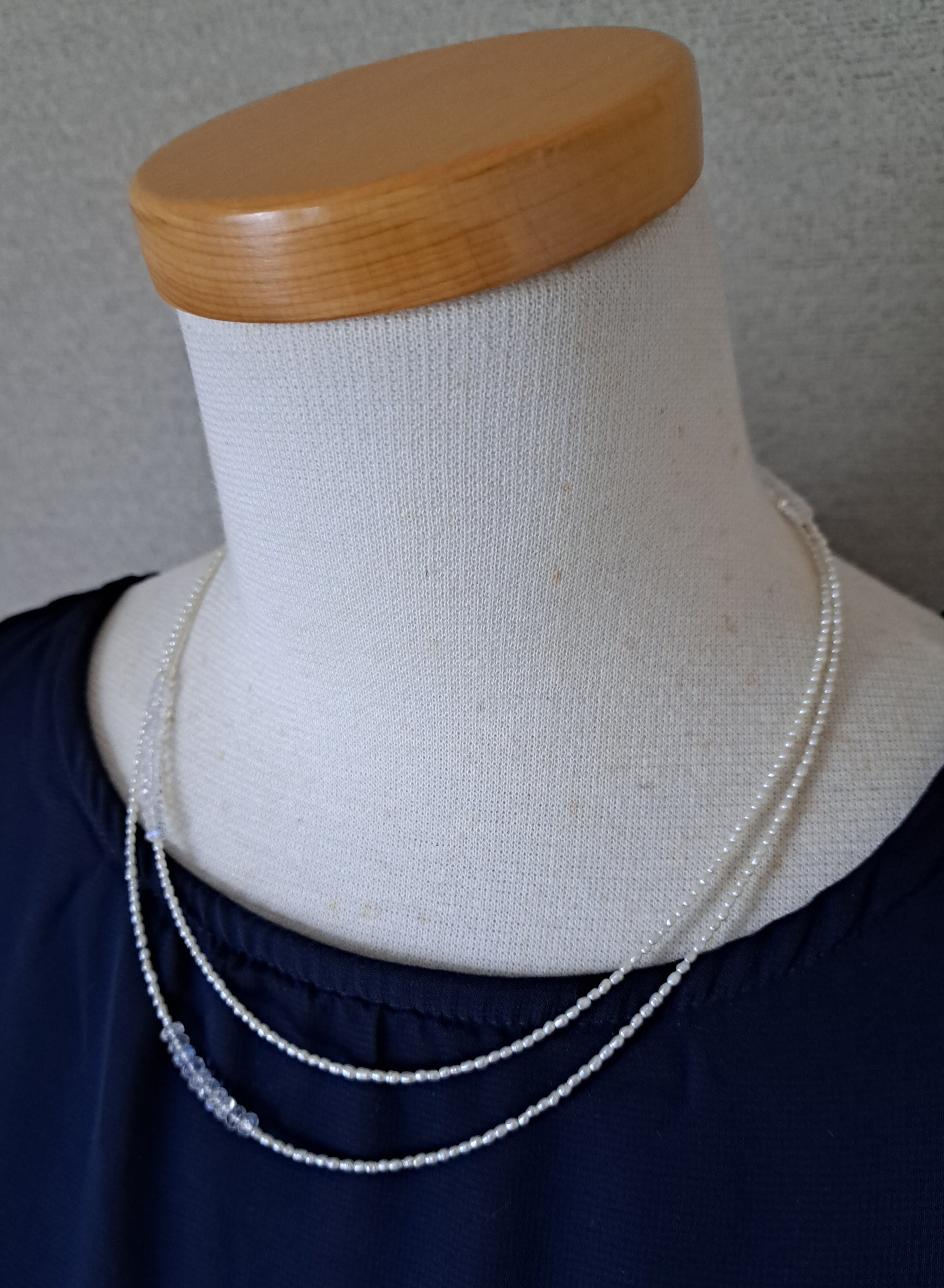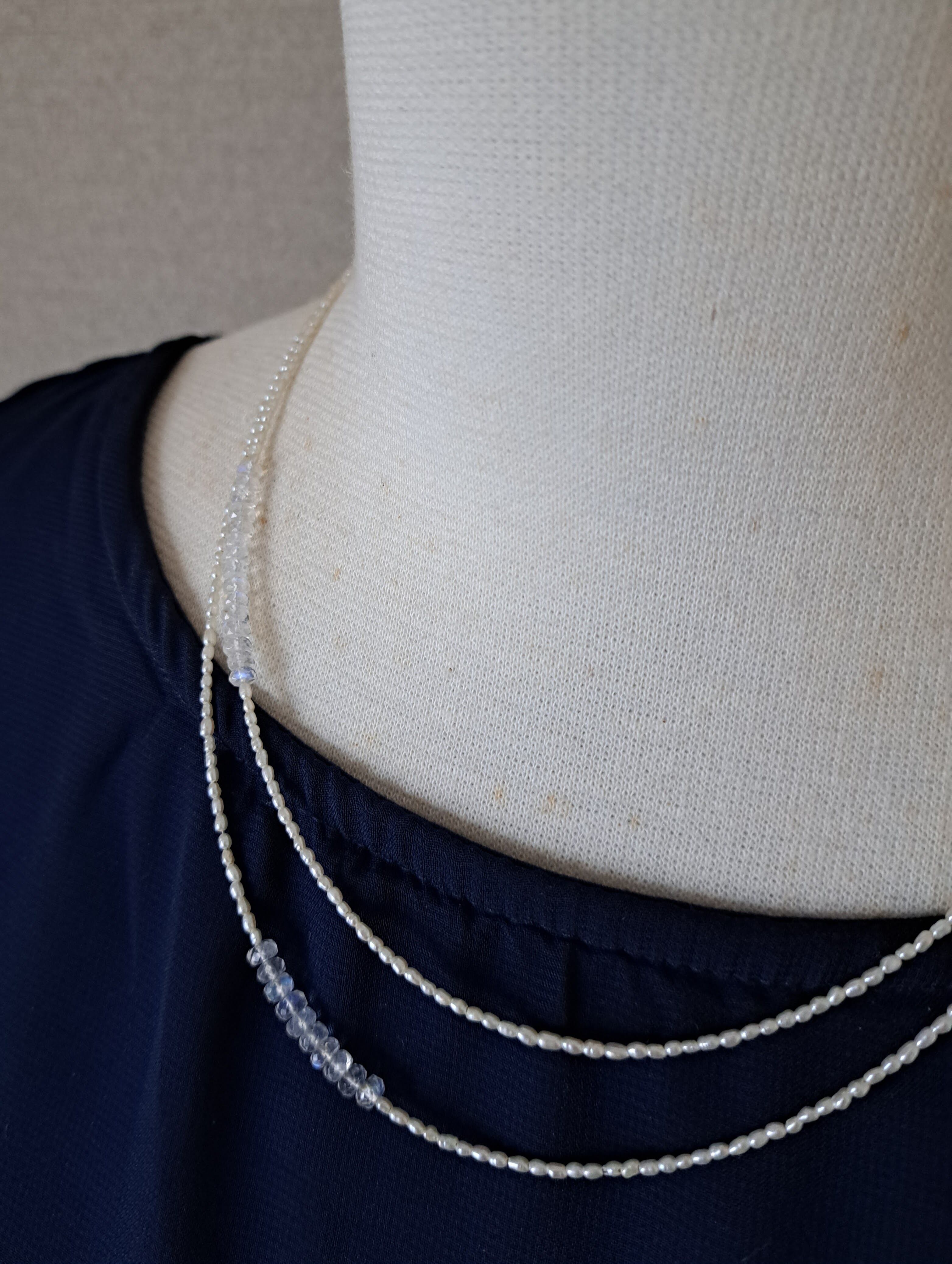 小さな淡水パールでさりげなく、じんわりと淡いブルーが優しく輝くブルームーンストーンをバランスよく3か所に配しデイリーユースに重ね付けに大活躍なロングネックレス!