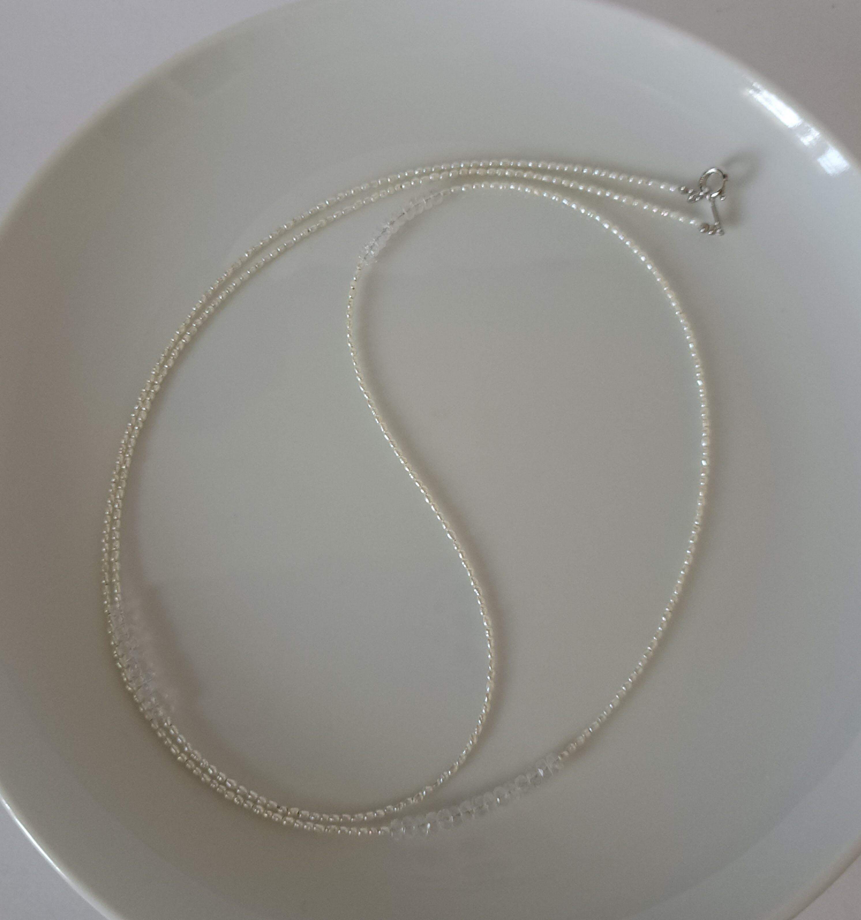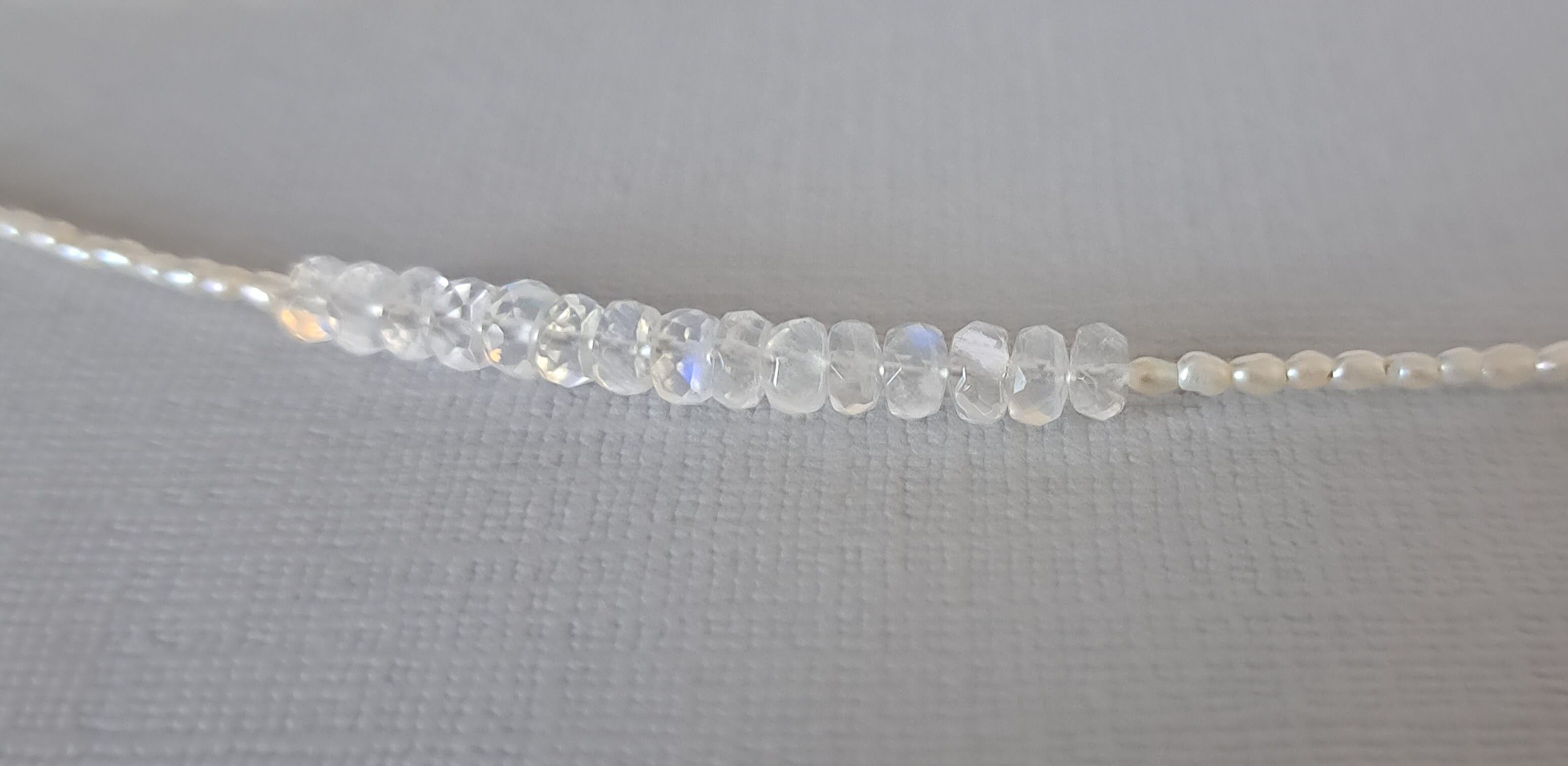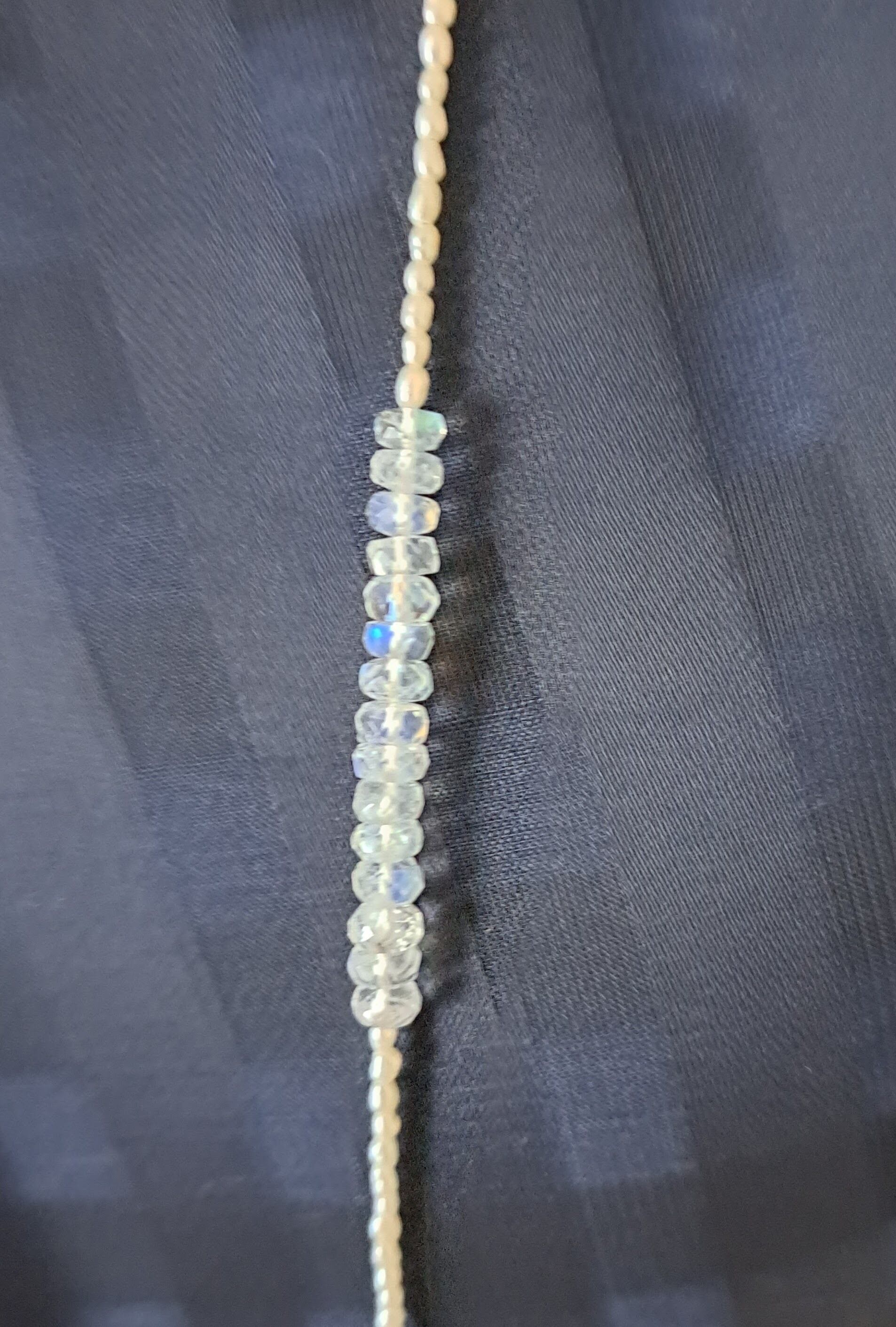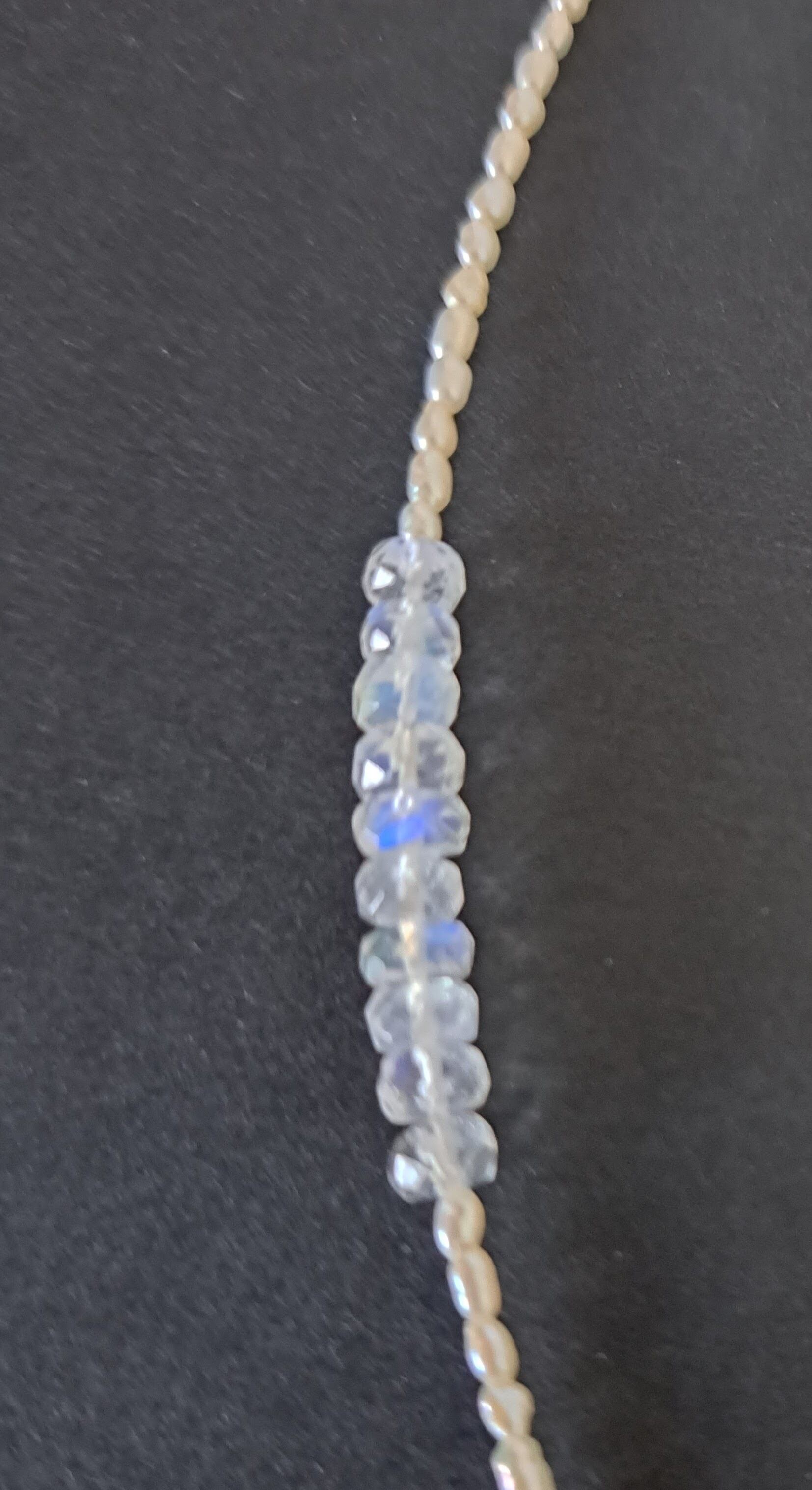小さな淡水パールでさりげなく、じんわりと淡いブルーが優しく輝くブルームーンストーンをバランスよく3か所に配しデイリーユースに重ね付けに大活躍なロングネックレス!