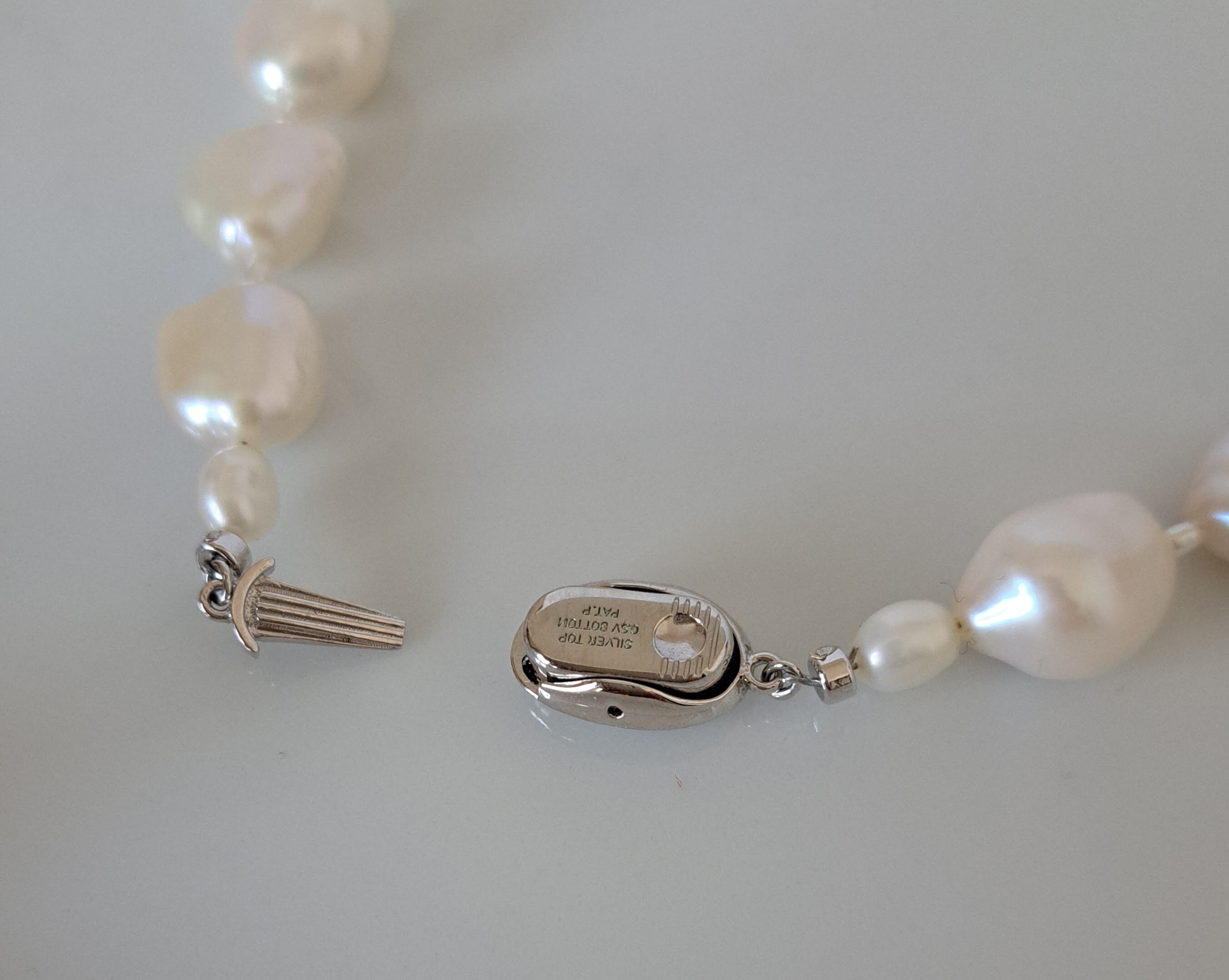 ボリュームのある大きい粒に小さな淡水パールを間に入れることでより個性的な形と照りがより際立つように仕立てています。