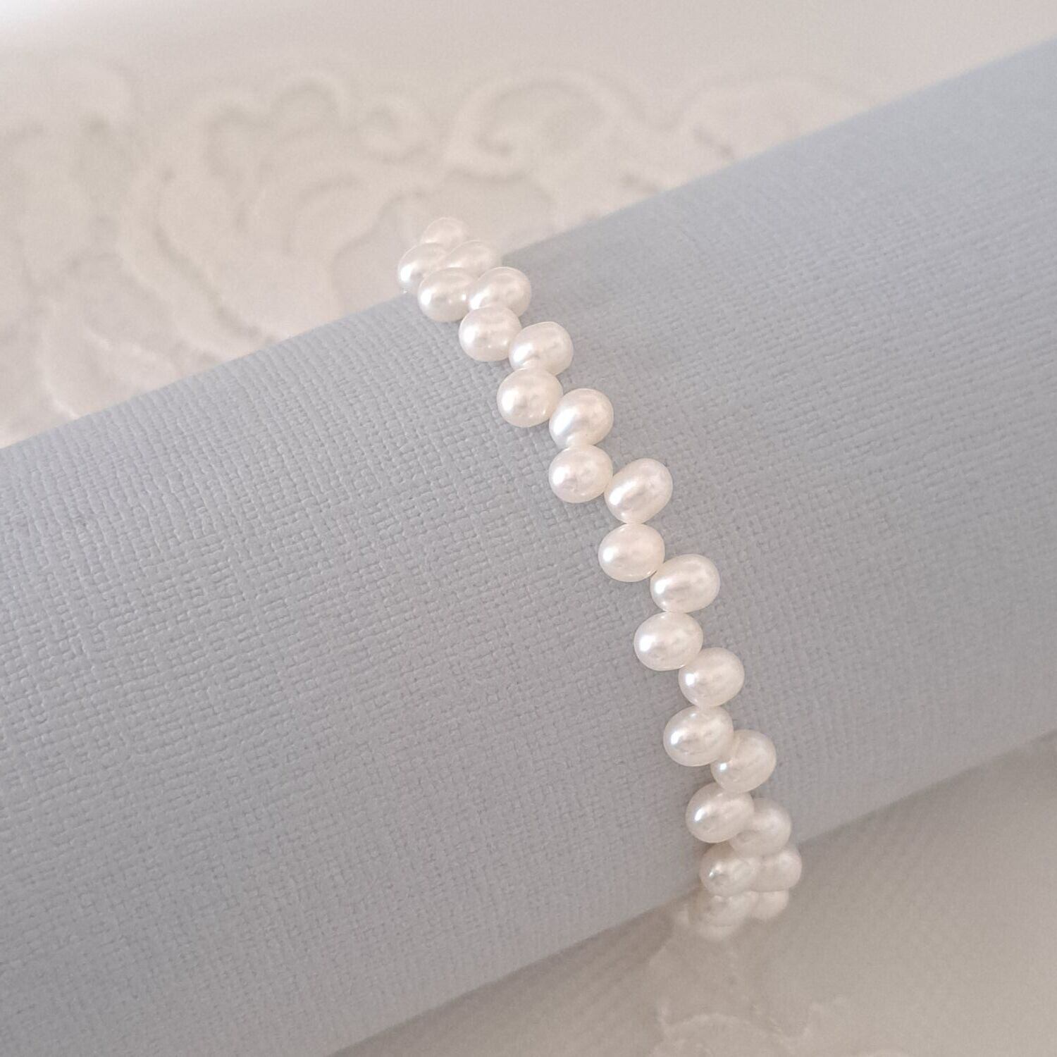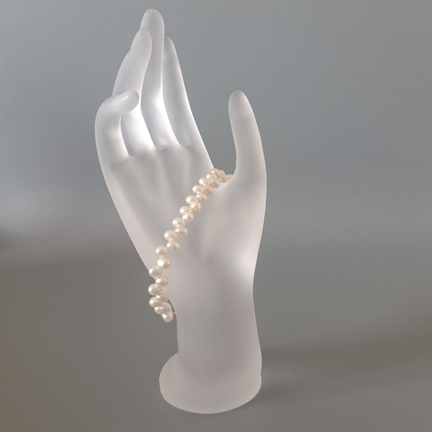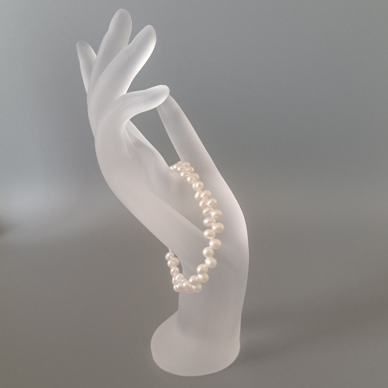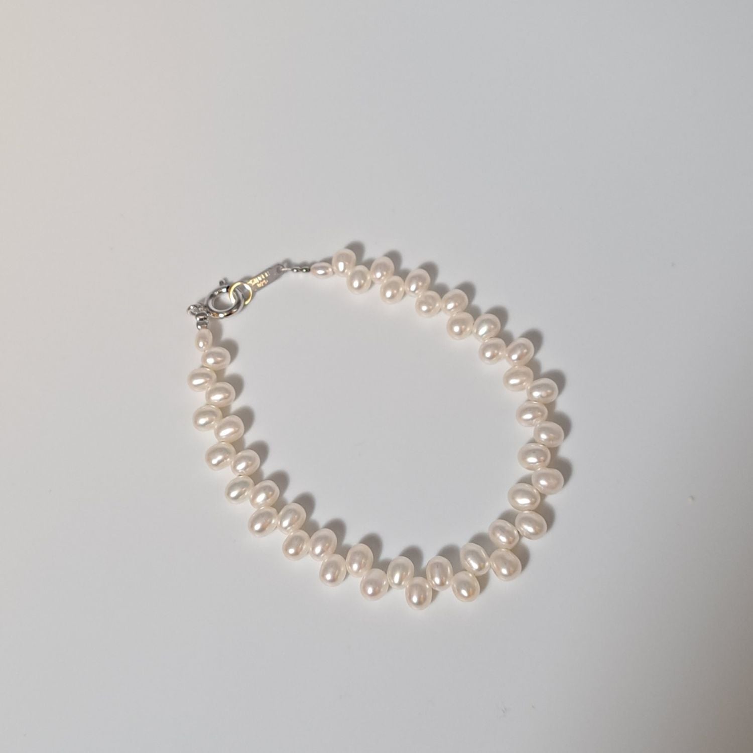 1/3ほどに穴を開けた淡水パールは「クレオパトラパール」と呼ばれ、その動き出すような印象が特徴です。このパールが左右交互に向きを変えて組まれたデザインのブレスレットは、まるで自身の視界を映し出しているかのよう。どちらの方向に向いても、視界には愛があふれ、腕元に優しく馴染みます。