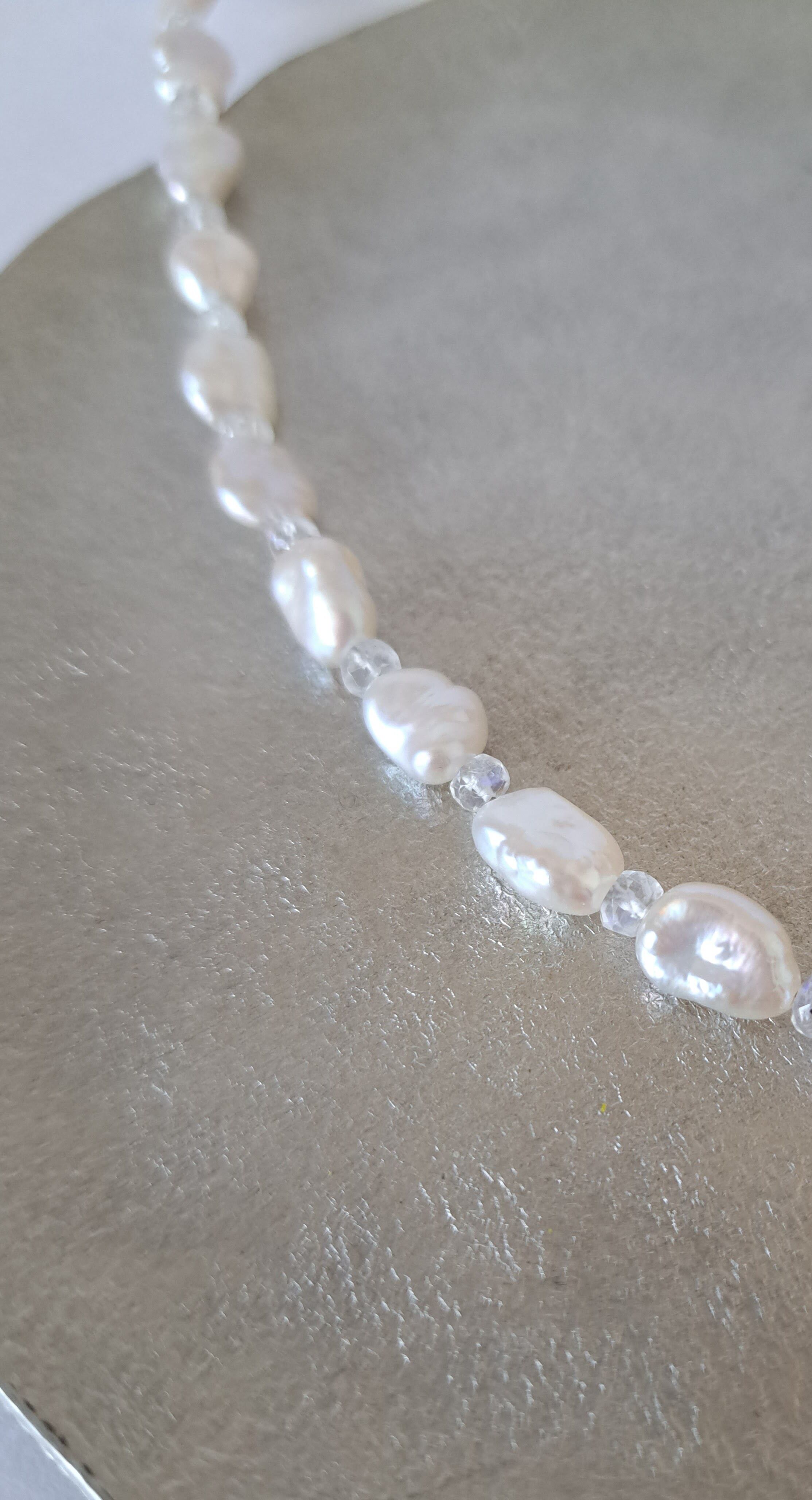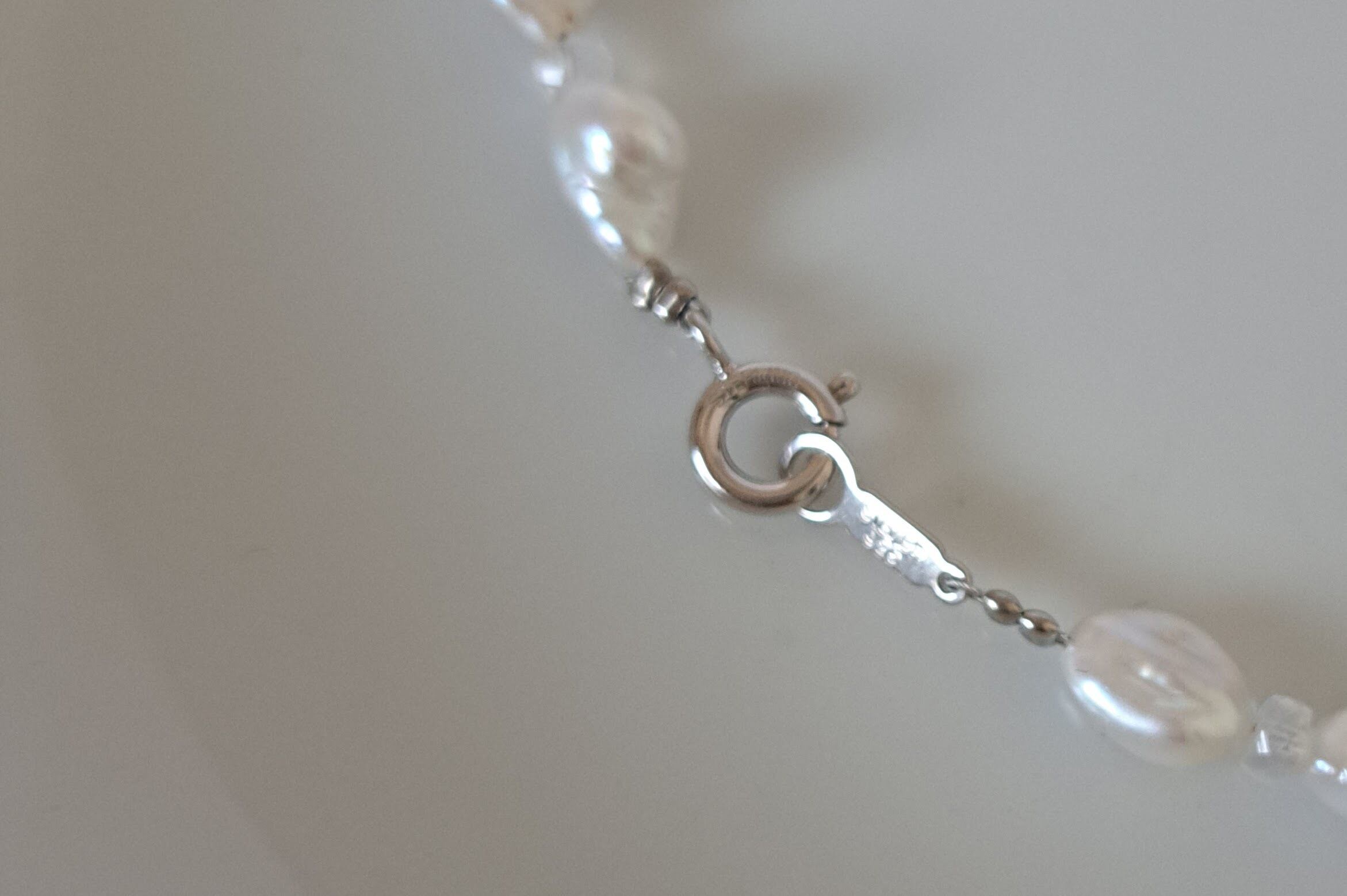 じんわりと淡いブルームーンストーンがホワイト系の淡水パールと淡水パールの間で優しく輝く上品なネックレス。