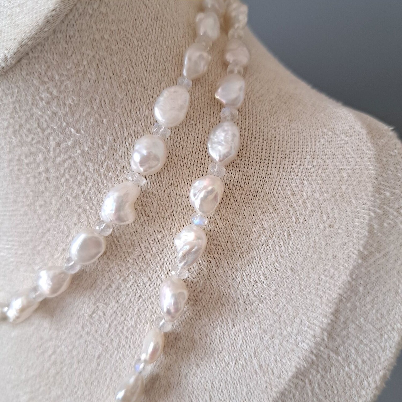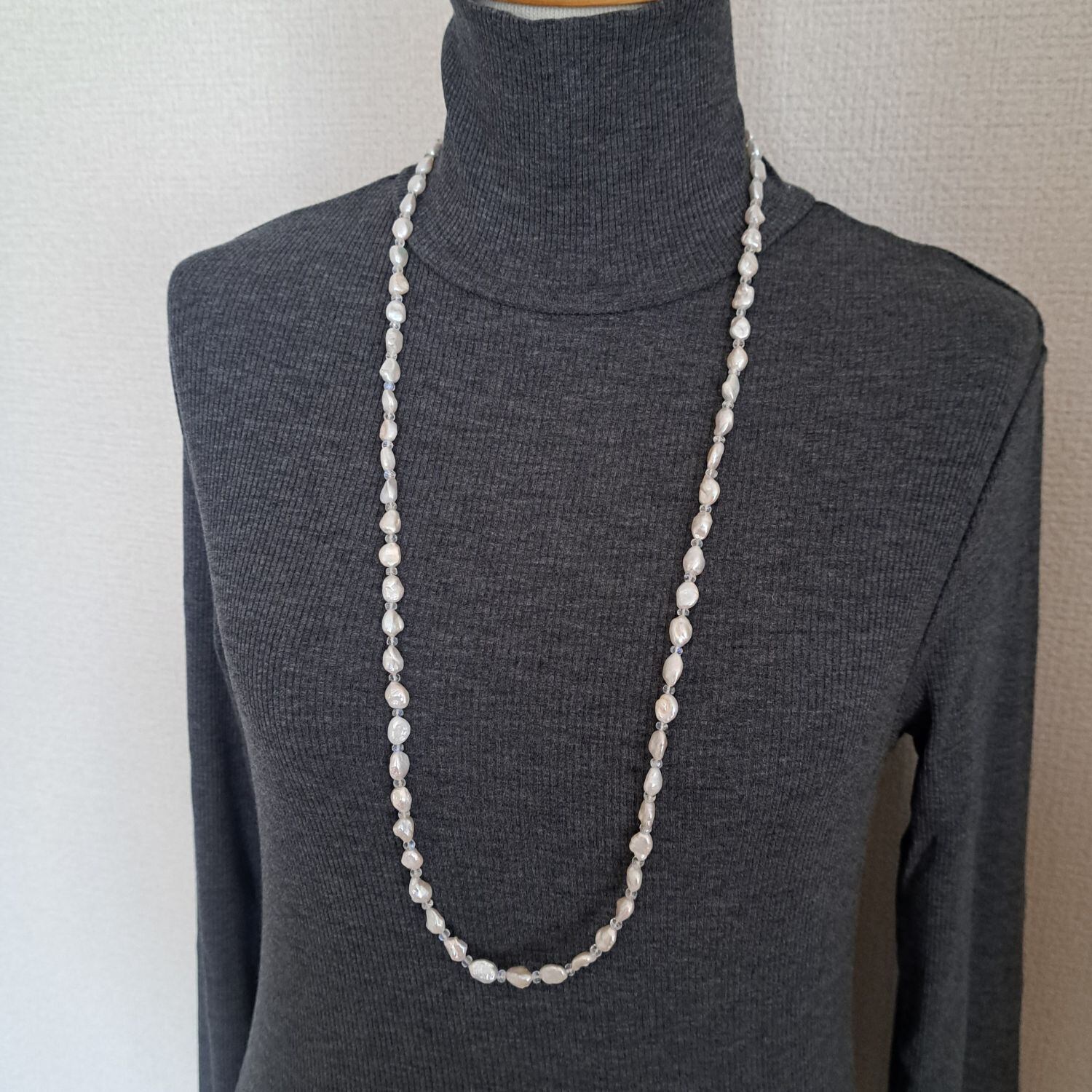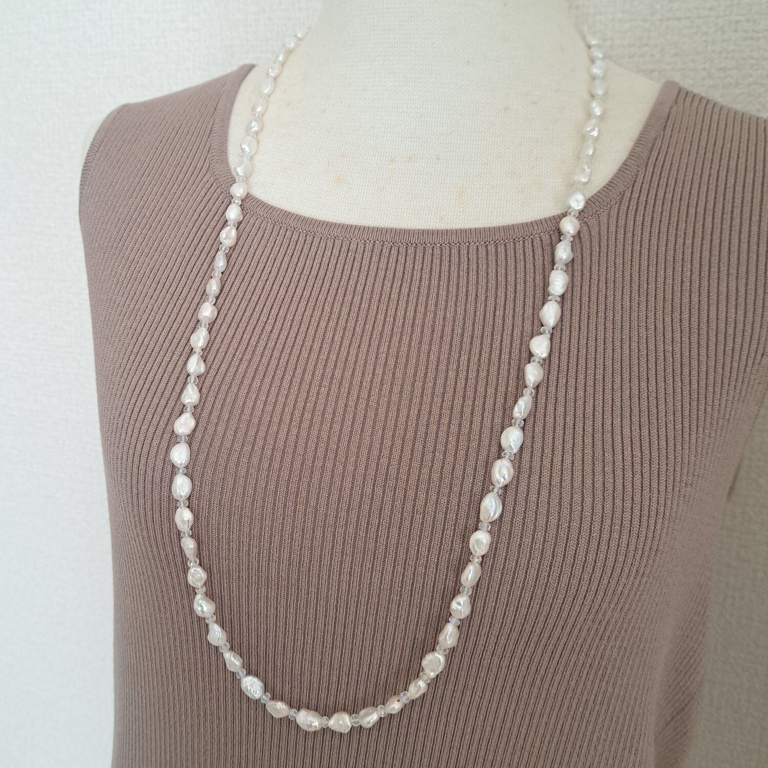 淡いブルームーンストーンが、ホワイト系の淡水パールのあいだでやさしく光を重ねる上品なロングネックレス。