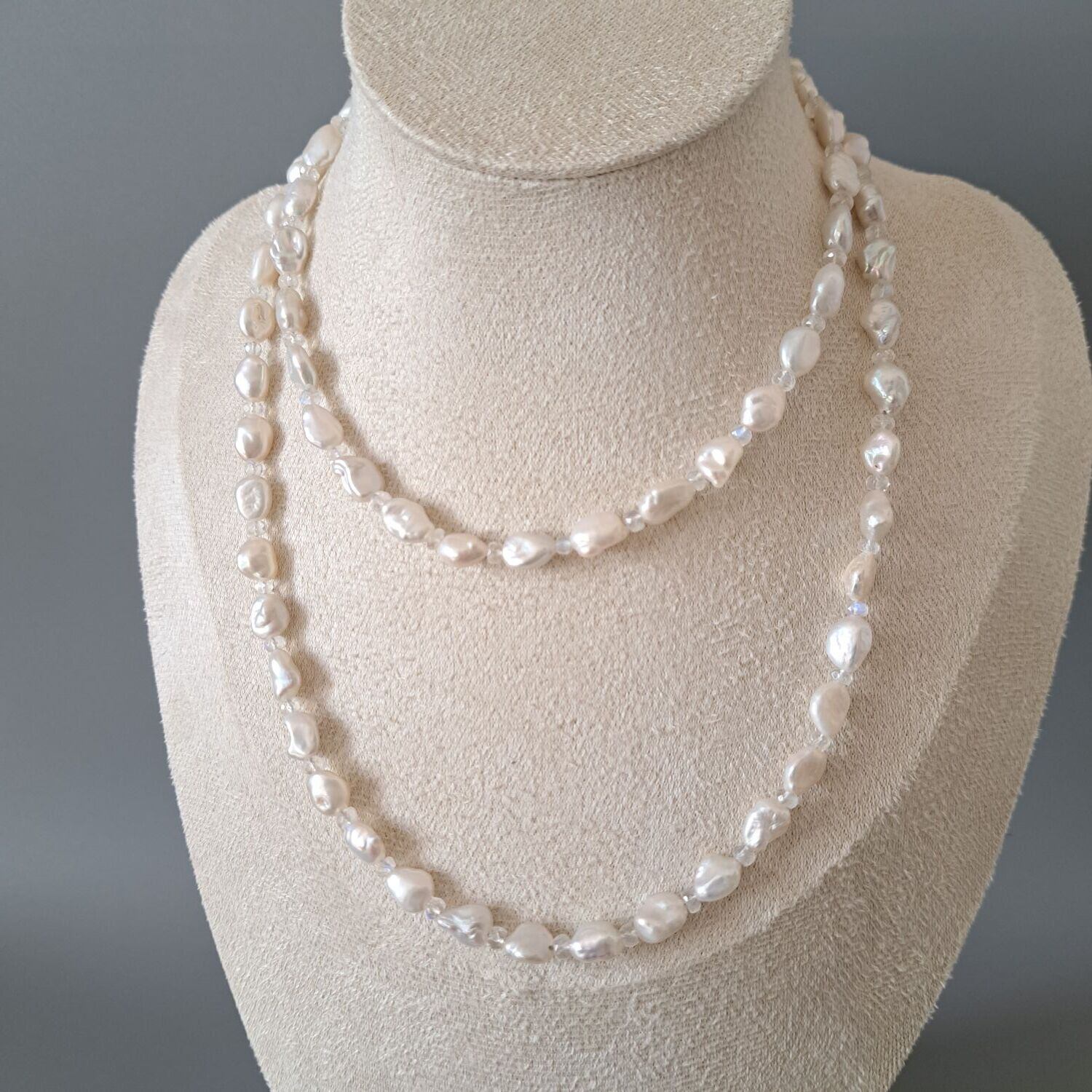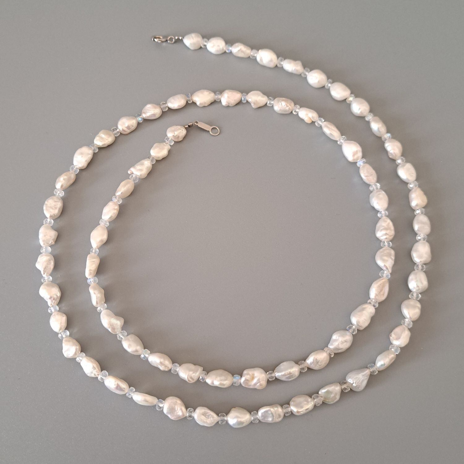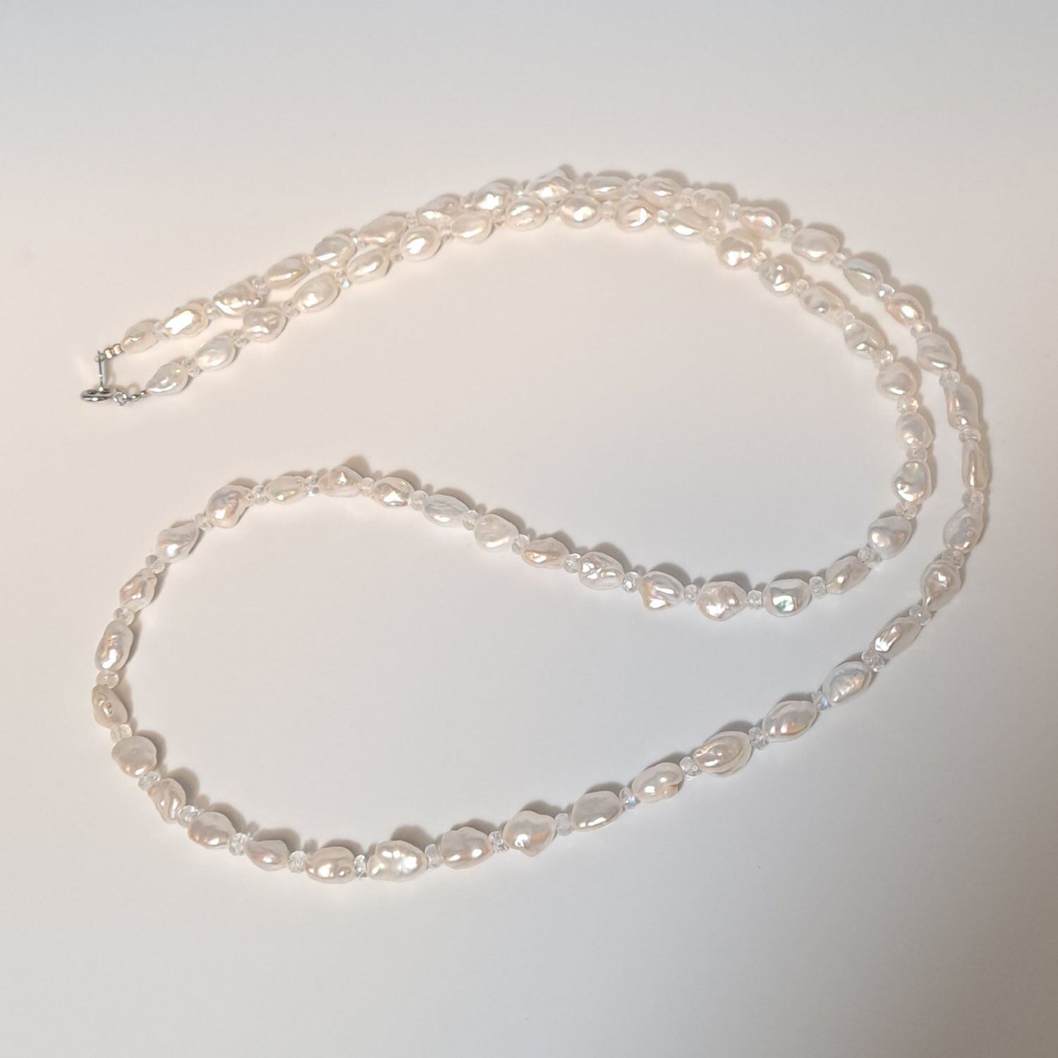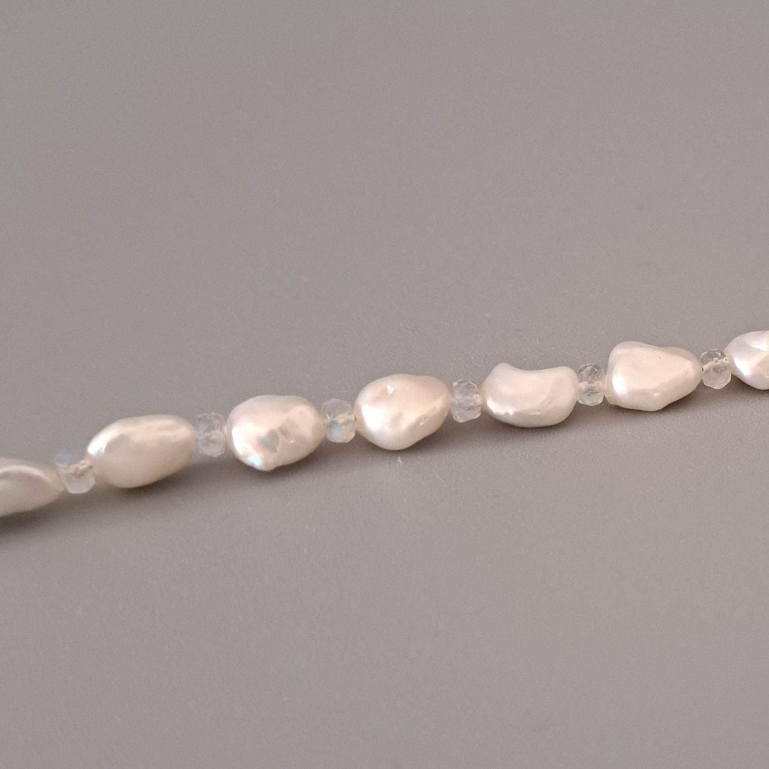 淡いブルームーンストーンが、ホワイト系の淡水パールのあいだでやさしく光を重ねる上品なロングネックレス。
