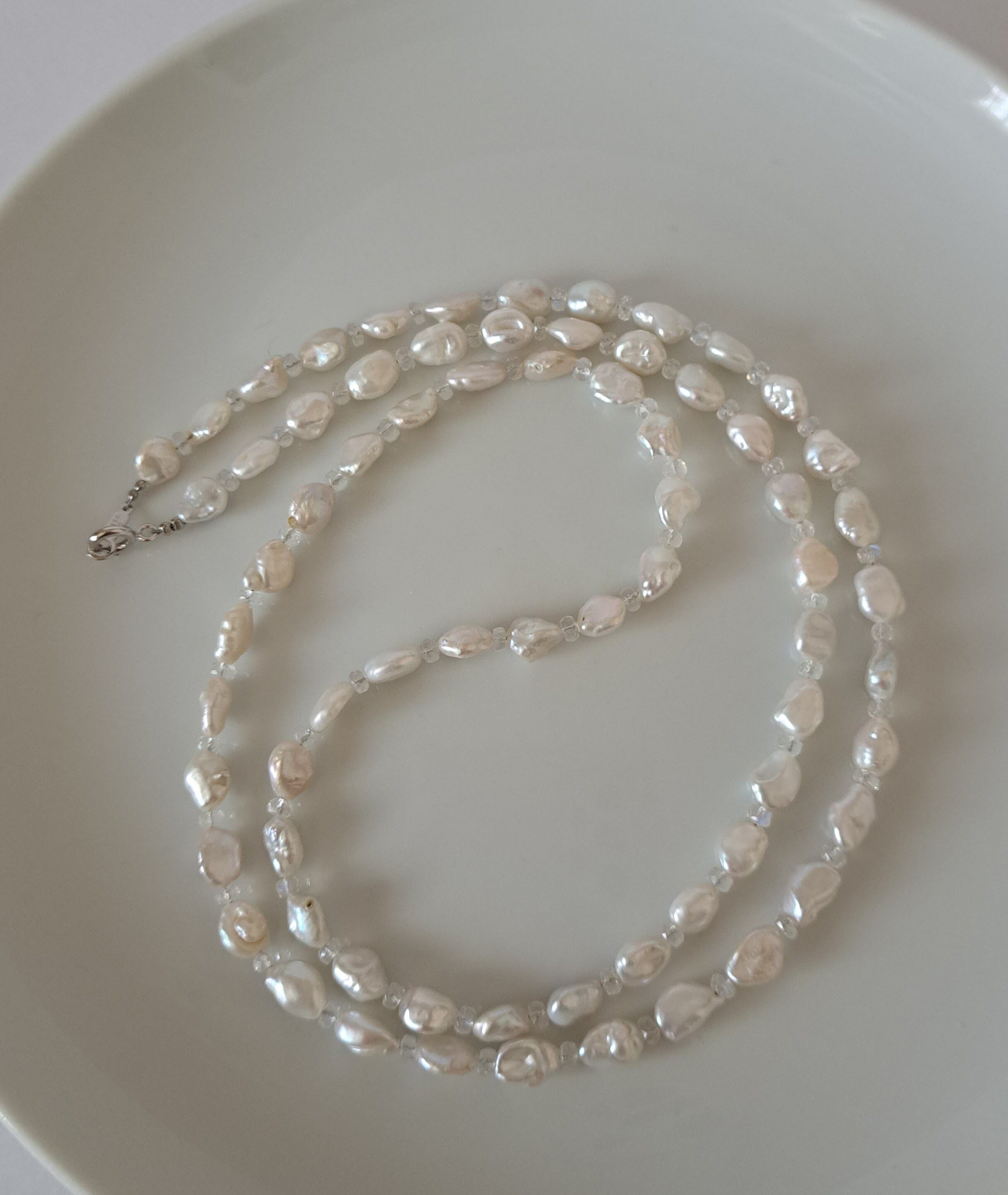じんわりと淡いブルームーンストーンがホワイト系の淡水パールと淡水パールの間で優しく輝く上品なロングネックレスネックレス。