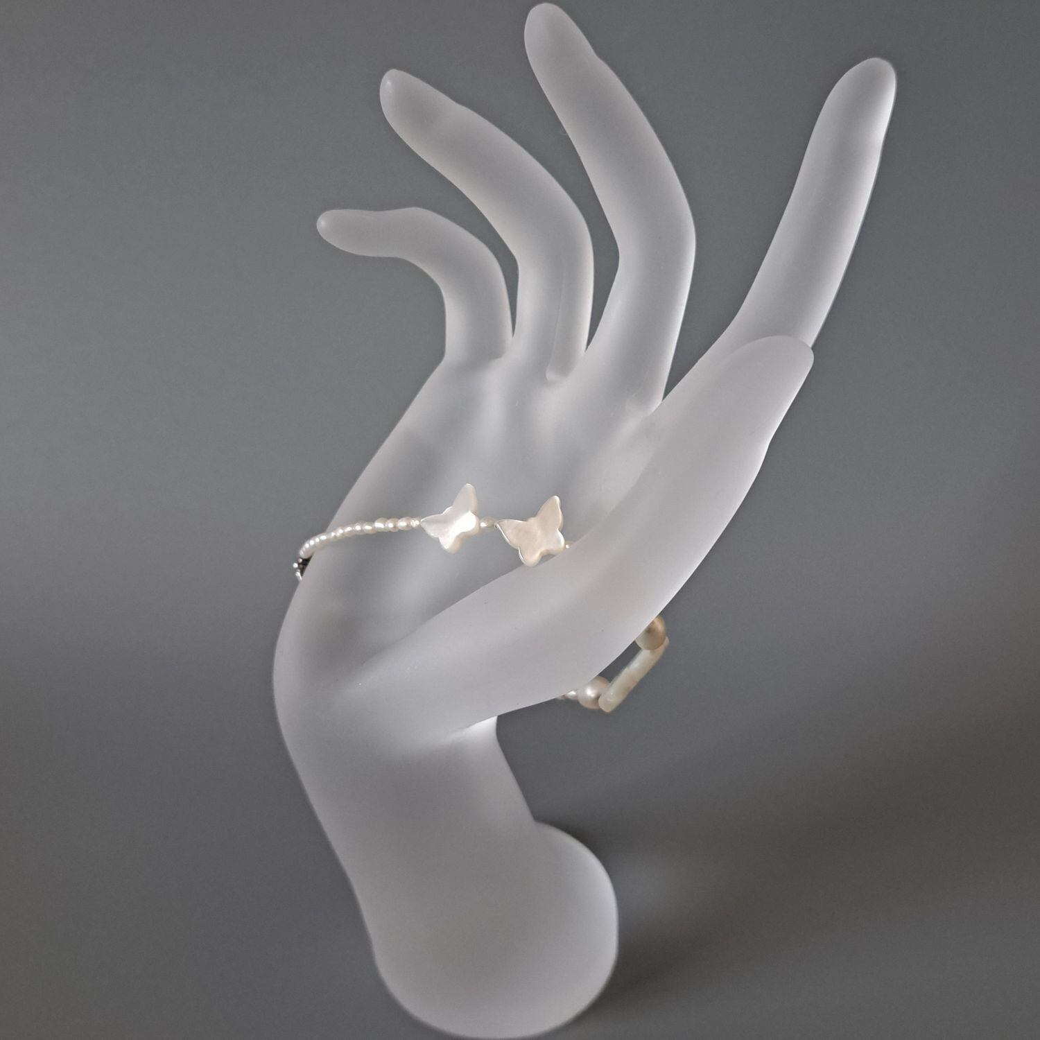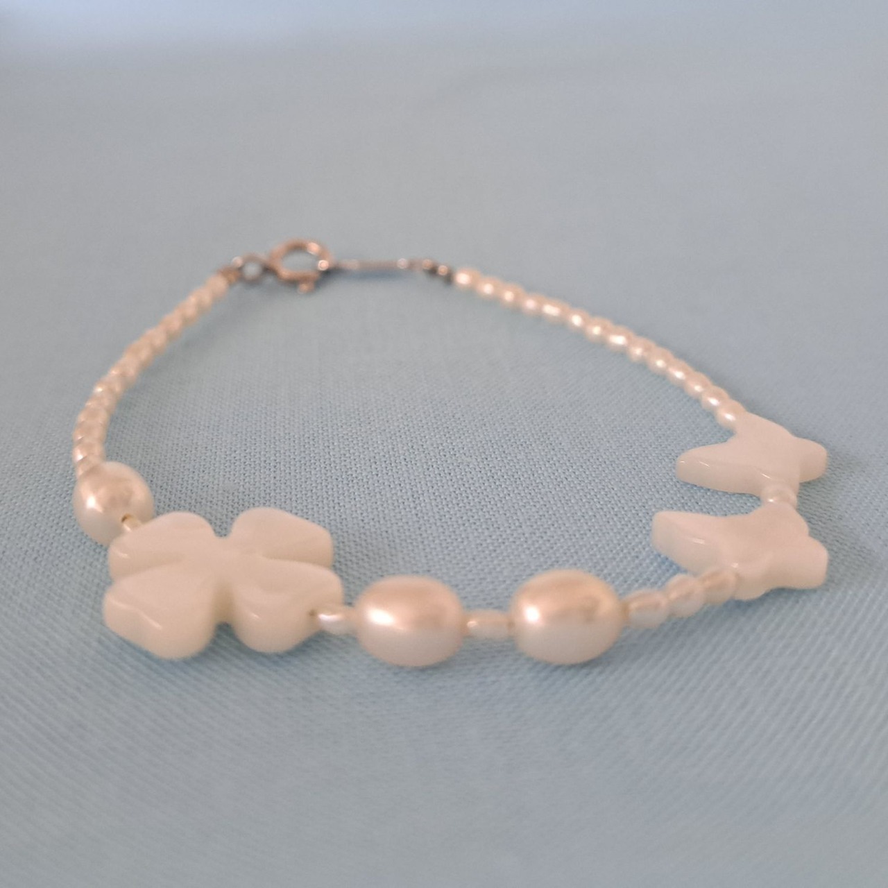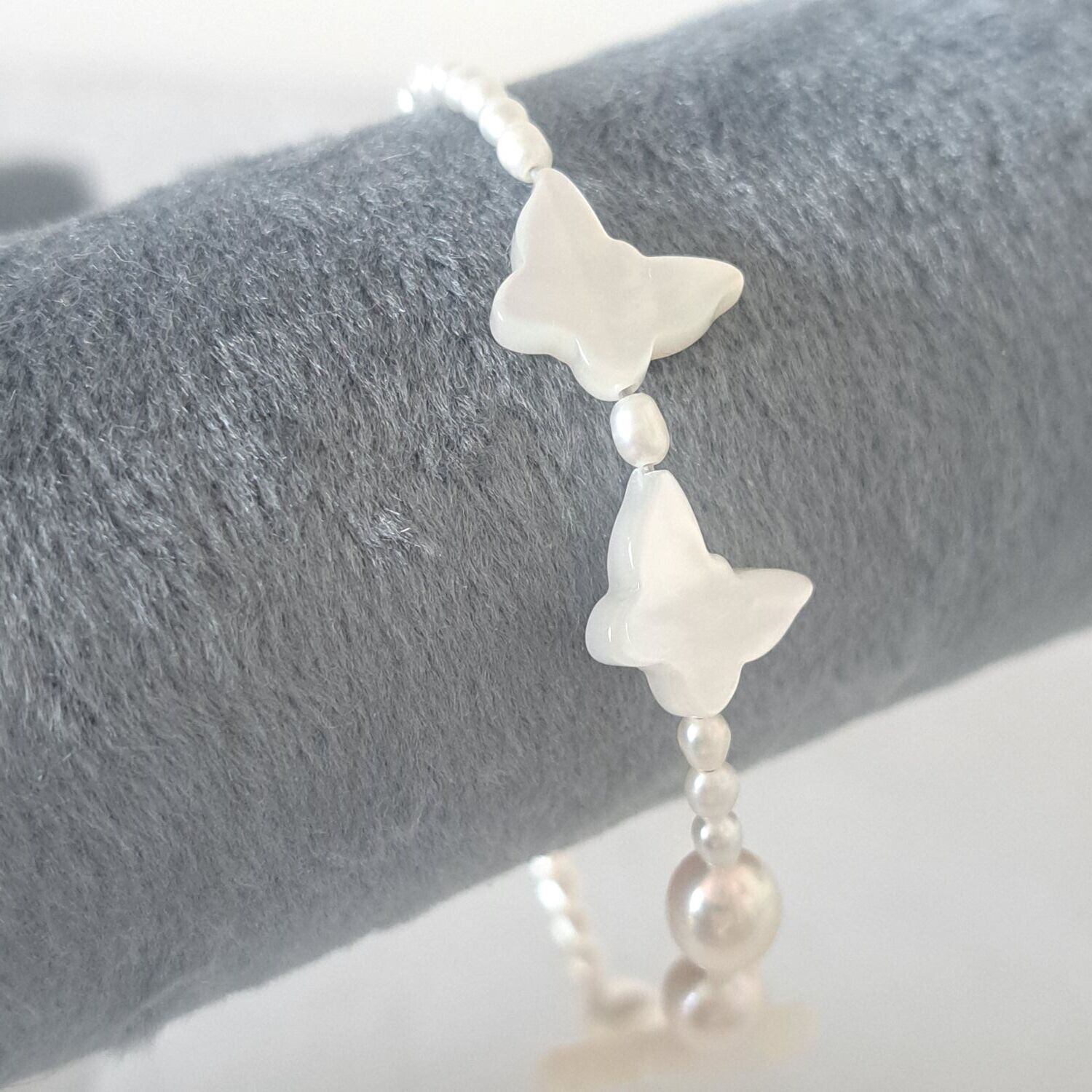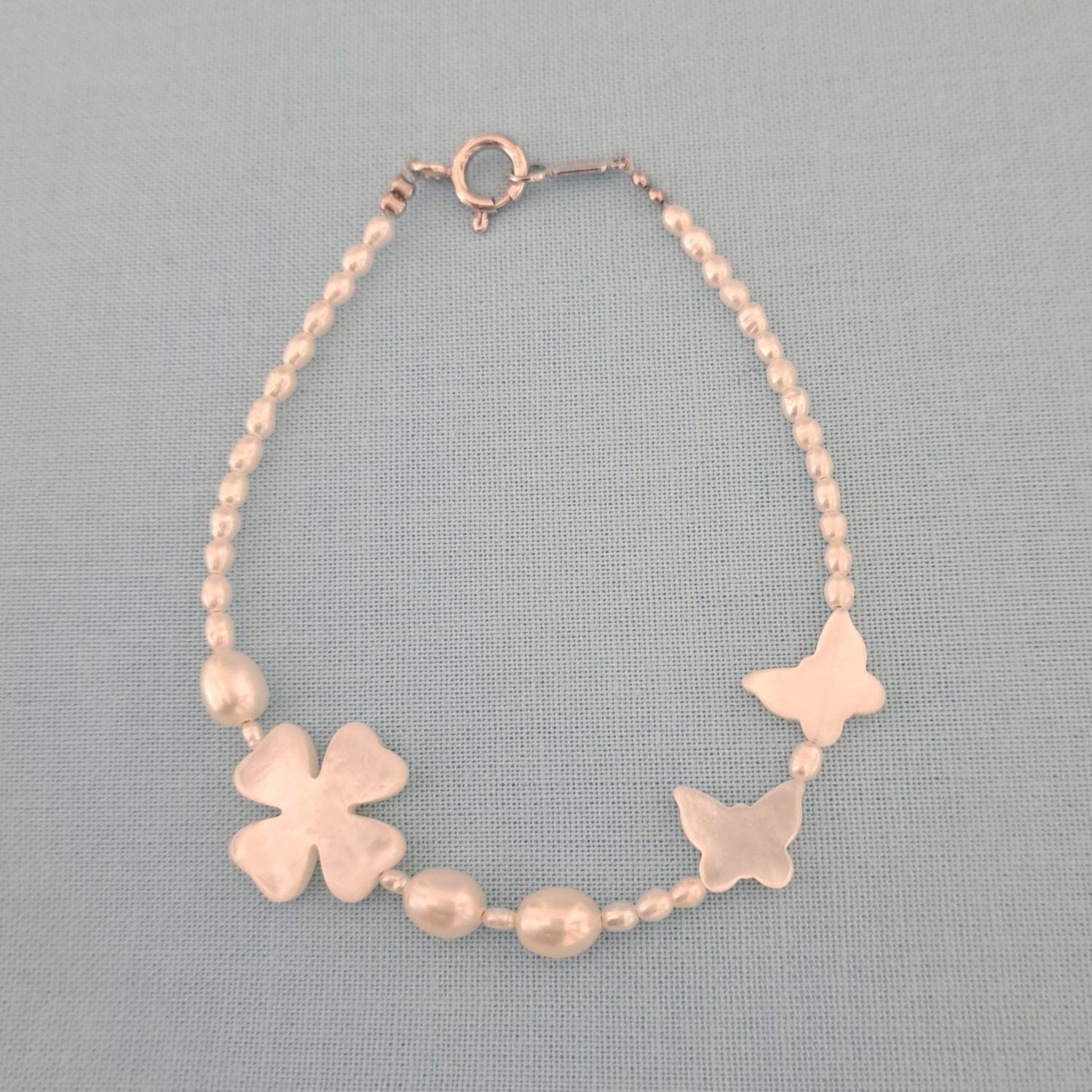 右側に蝶々が2頭 左側にクローバー ラッキーアイテムが2つ配し、淡水パールを添えたデザインのブレスレットです!