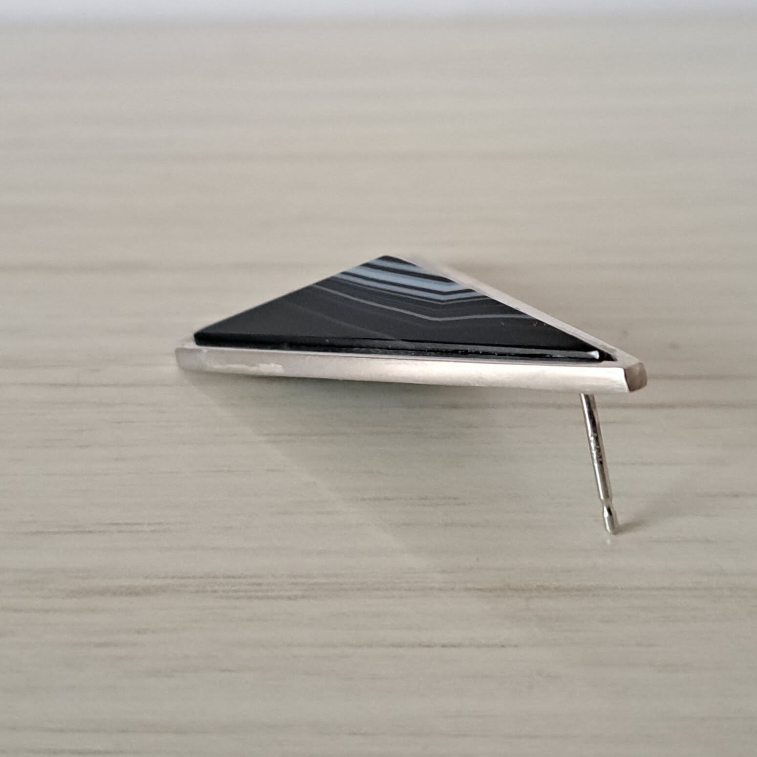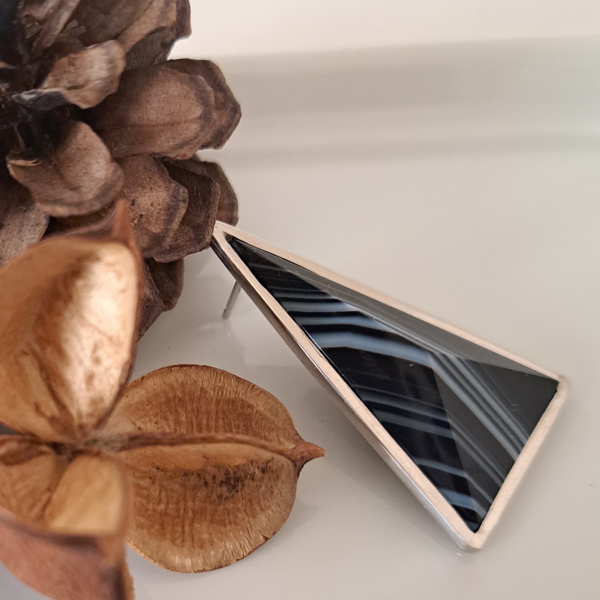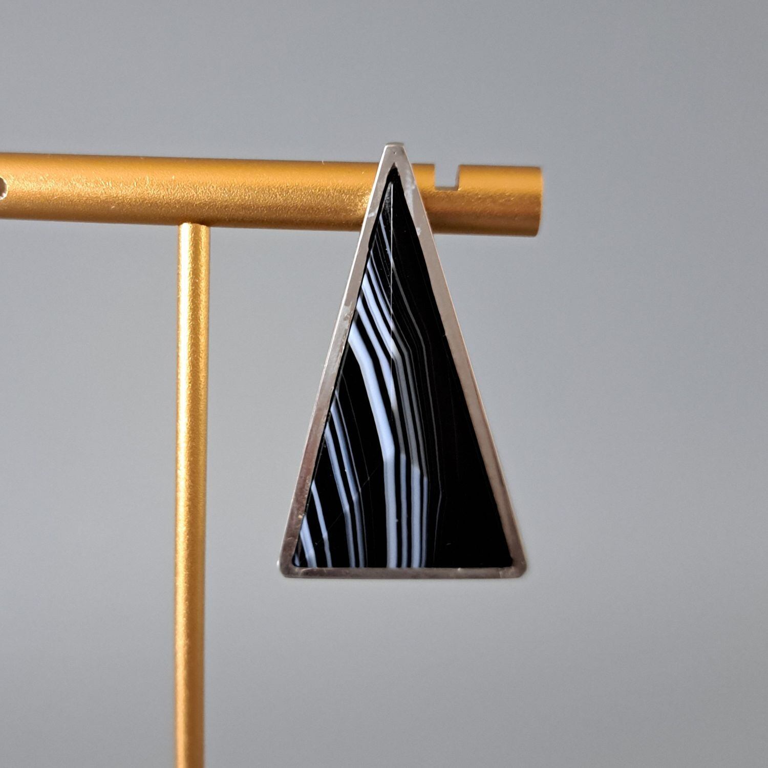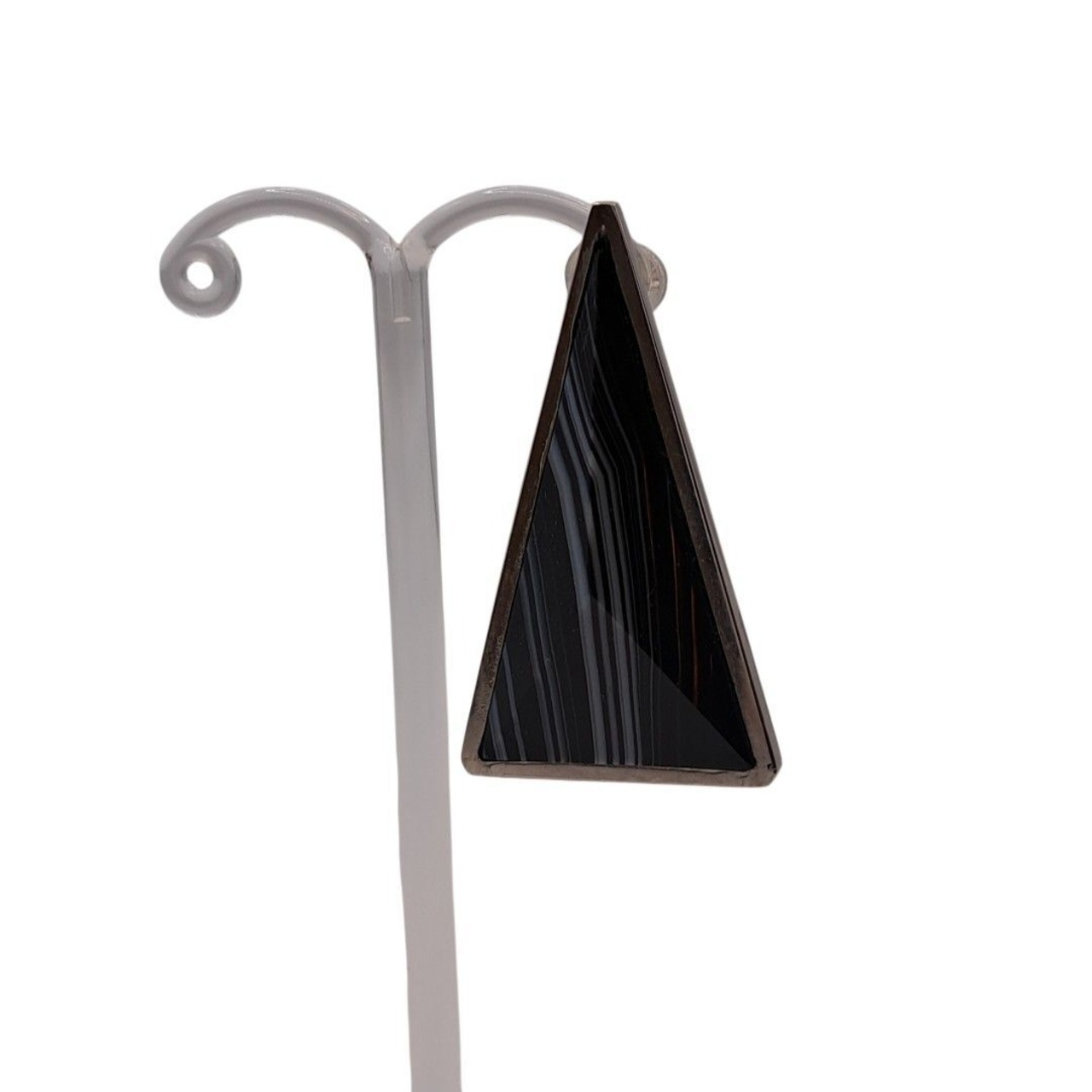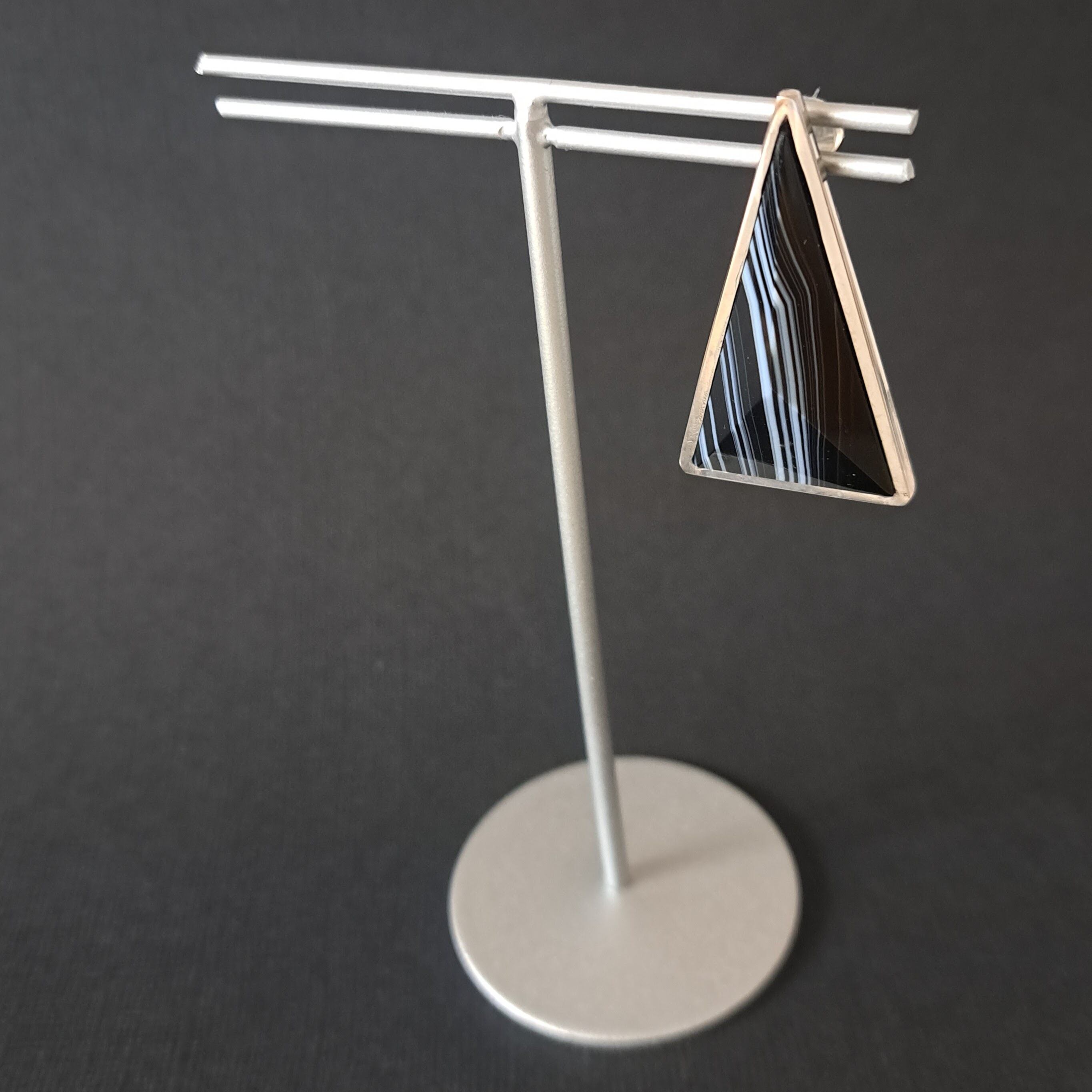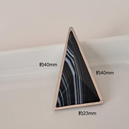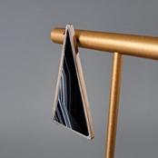 トライアングルの形をしたシックな天然石「シマオニキス」を使用した、大振りの片耳用ピアスが耳元で存在感を放つ一点もののジュエリーです。この神秘的な形状は、過去と未来、現実と夢の境界を曖昧にし、想像力をかき立てます。トライアングルの無限の解釈が、存在感とともに永遠に続いていく様子を彷彿とさせる、ユニセックスでお使いいただけるピアスです。