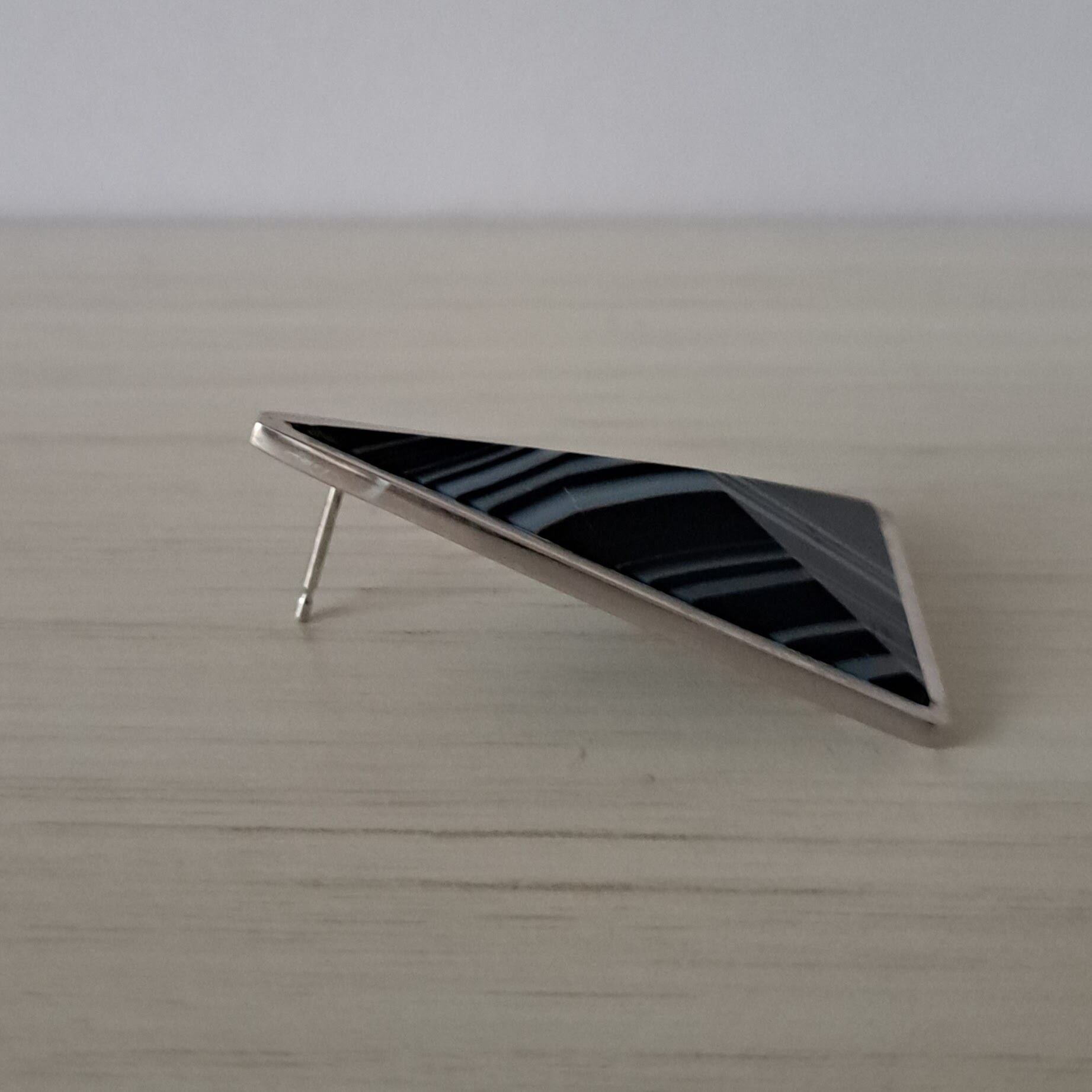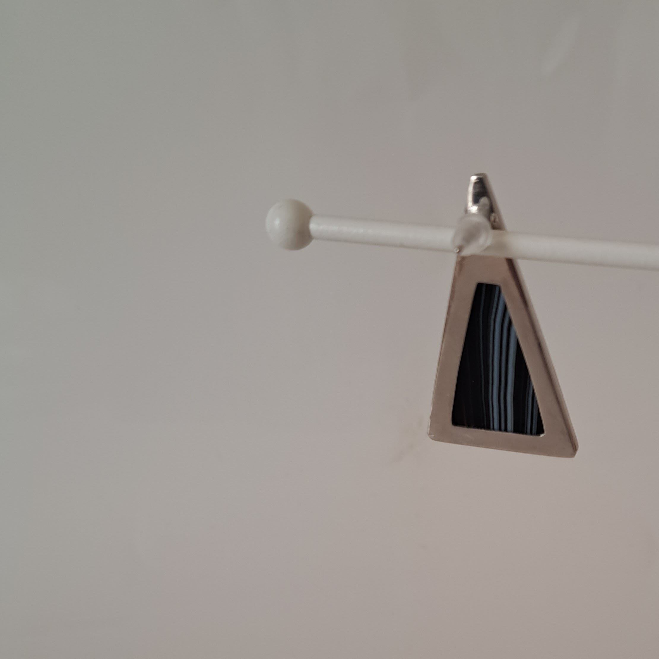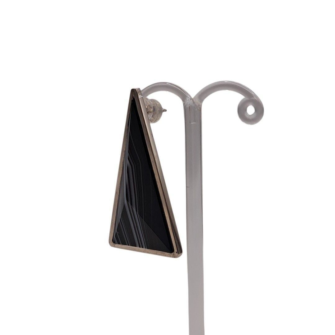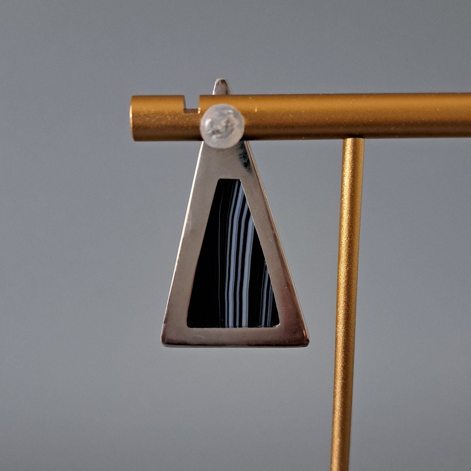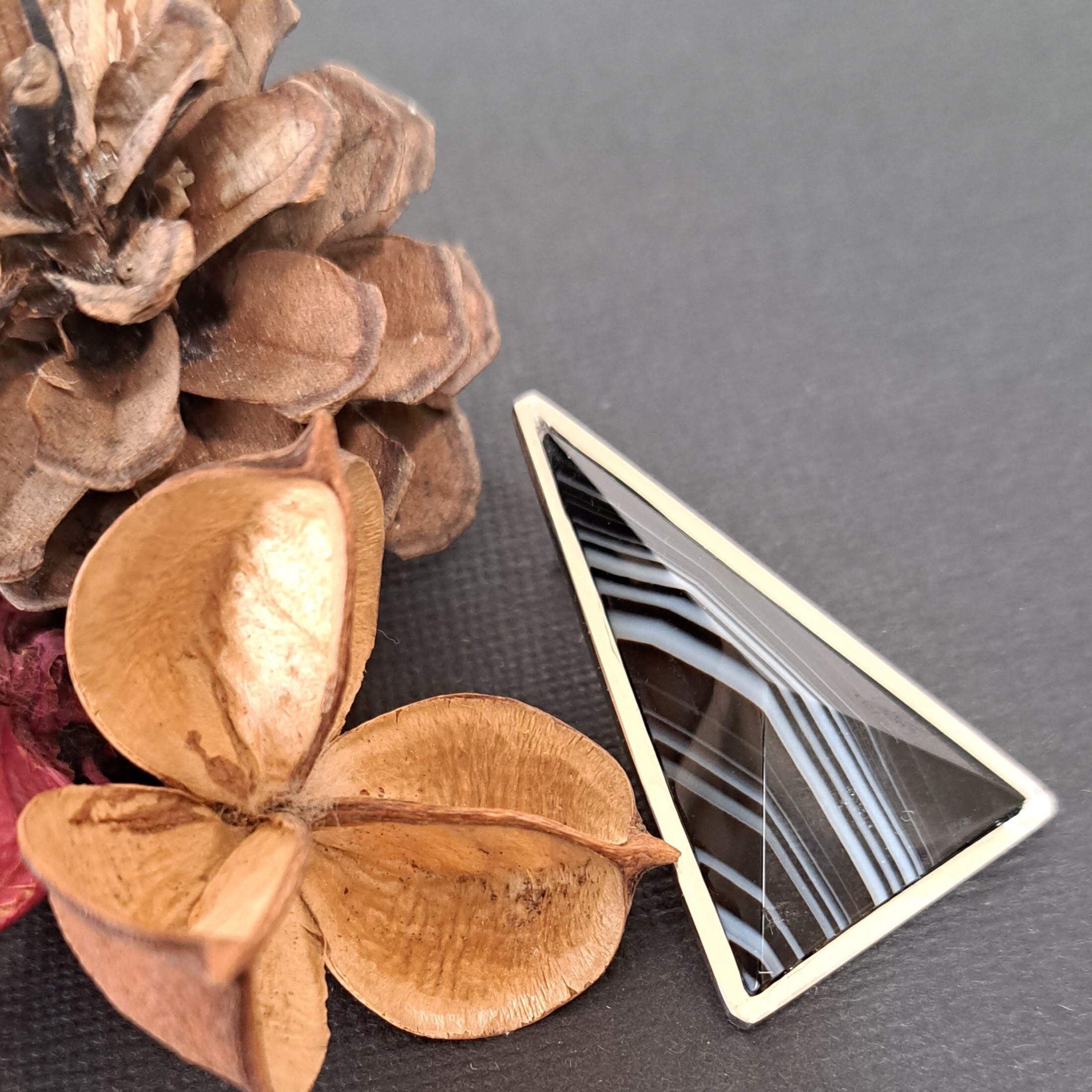 トライアングルの形をしたシックな天然石「シマオニキス」を使用した、大振りの片耳用ピアスが耳元で存在感を放つ一点もののジュエリーです。この神秘的な形状は、過去と未来、現実と夢の境界を曖昧にし、想像力をかき立てます。トライアングルの無限の解釈が、存在感とともに永遠に続いていく様子を彷彿とさせる、ユニセックスでお使いいただけるピアスです。