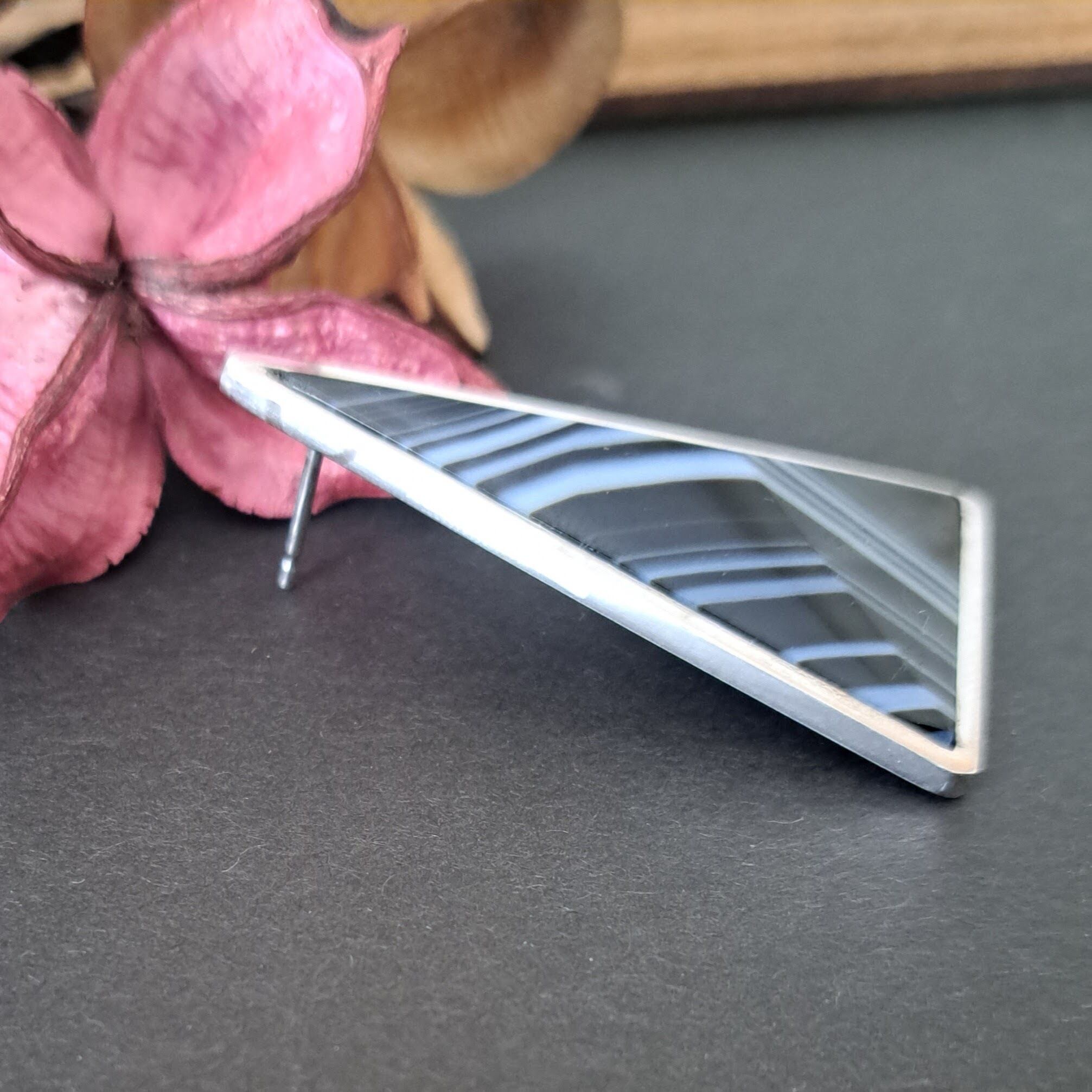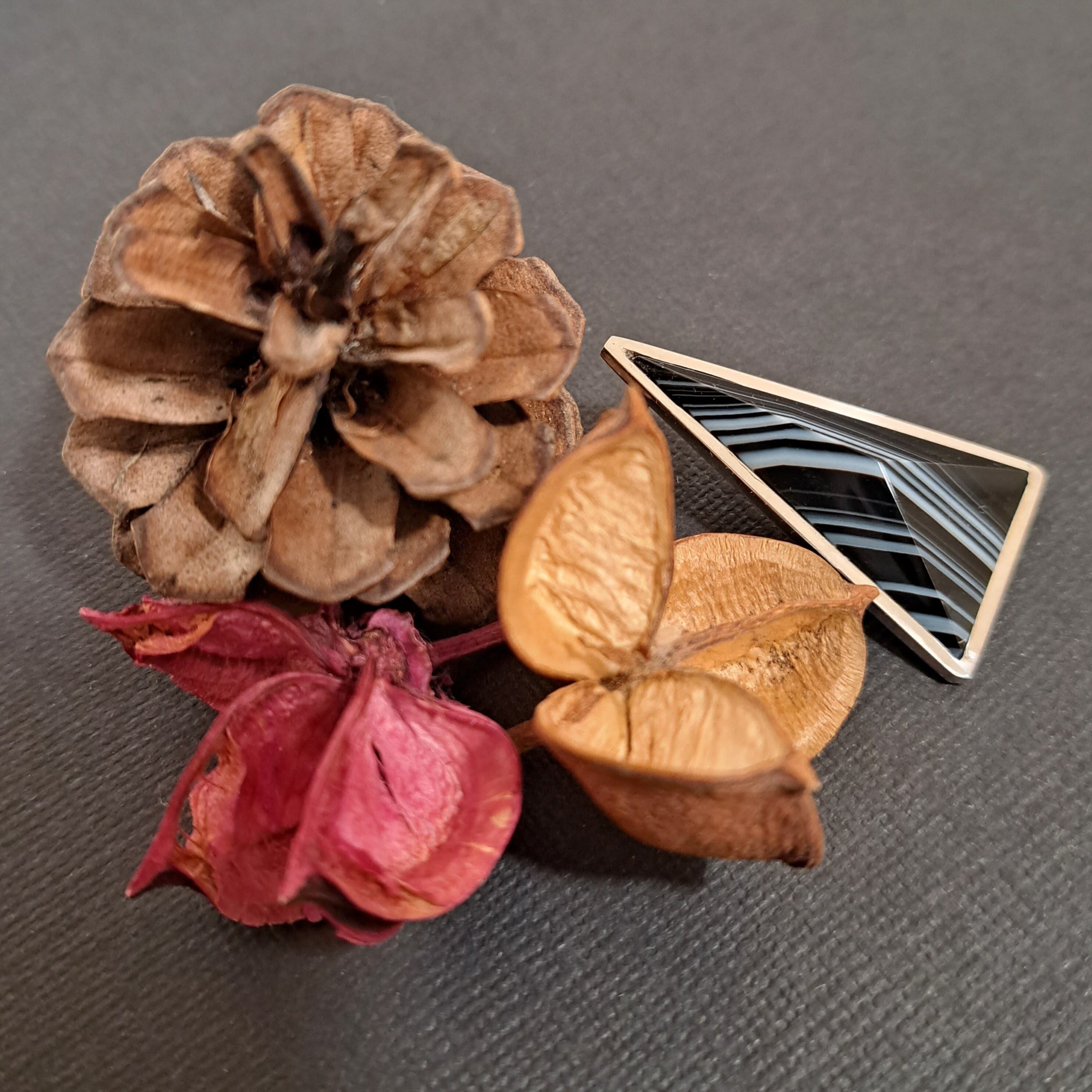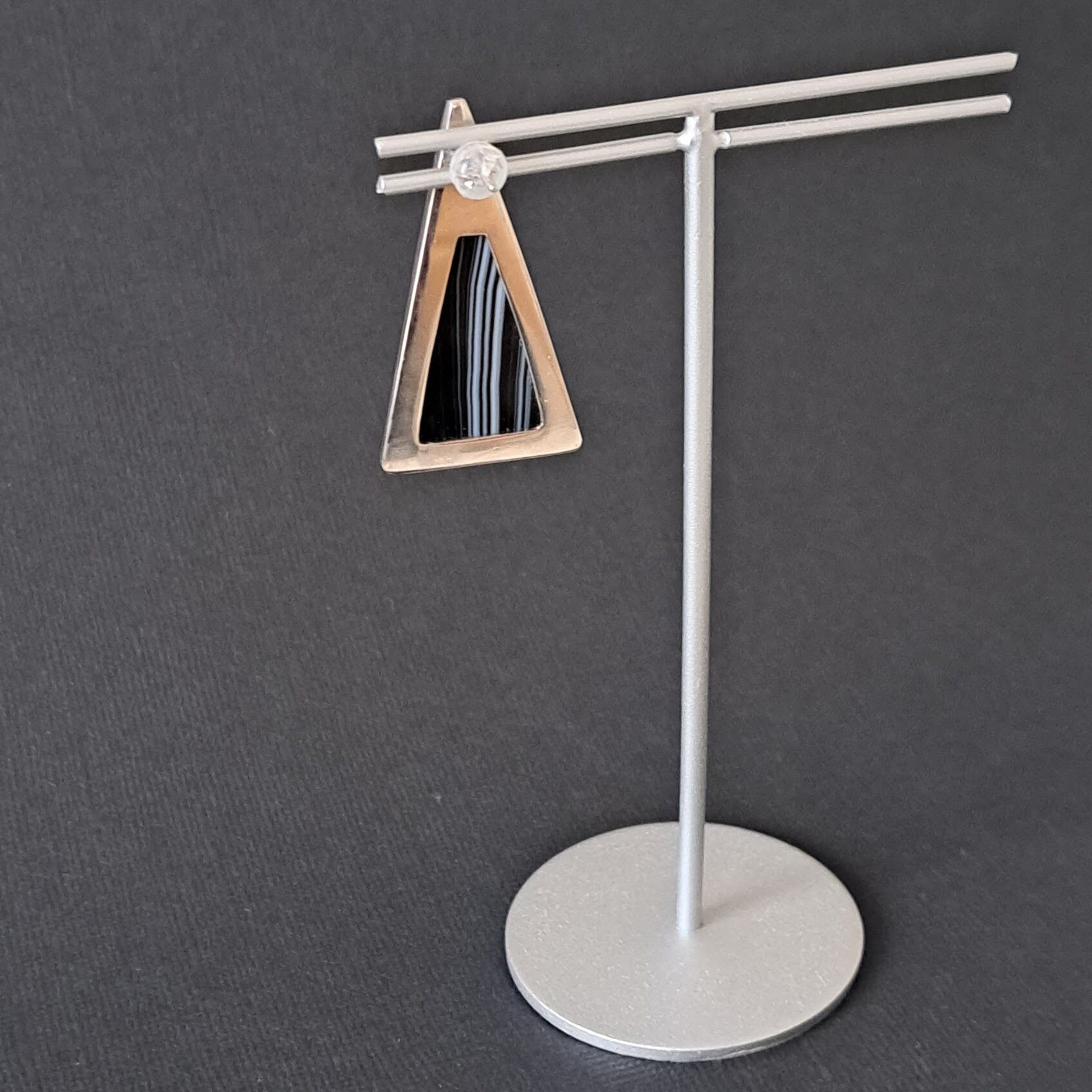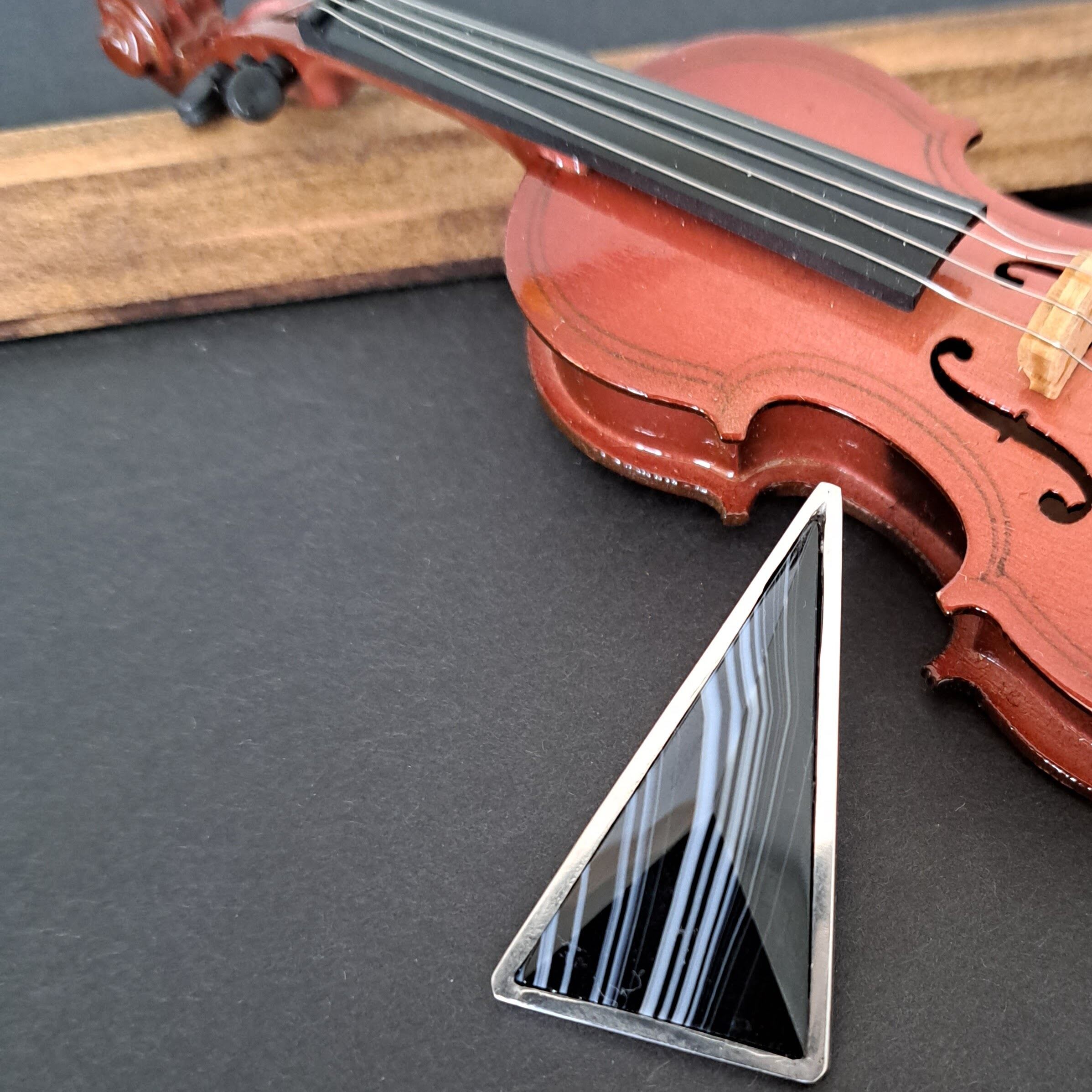 トライアングルの形をしたシックな天然石「シマオニキス」を使用した、大振りの片耳用ピアスが耳元で存在感を放つ一点もののジュエリーです。この神秘的な形状は、過去と未来、現実と夢の境界を曖昧にし、想像力をかき立てます。トライアングルの無限の解釈が、存在感とともに永遠に続いていく様子を彷彿とさせる、ユニセックスでお使いいただけるピアスです。