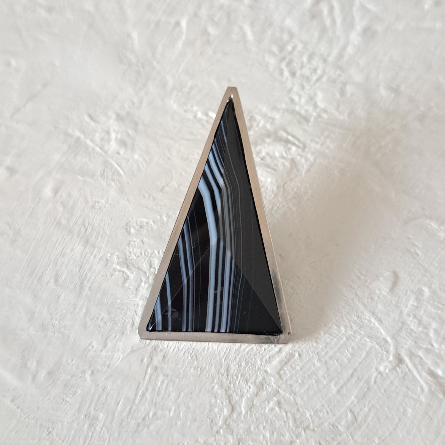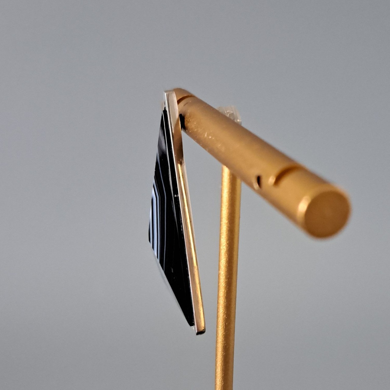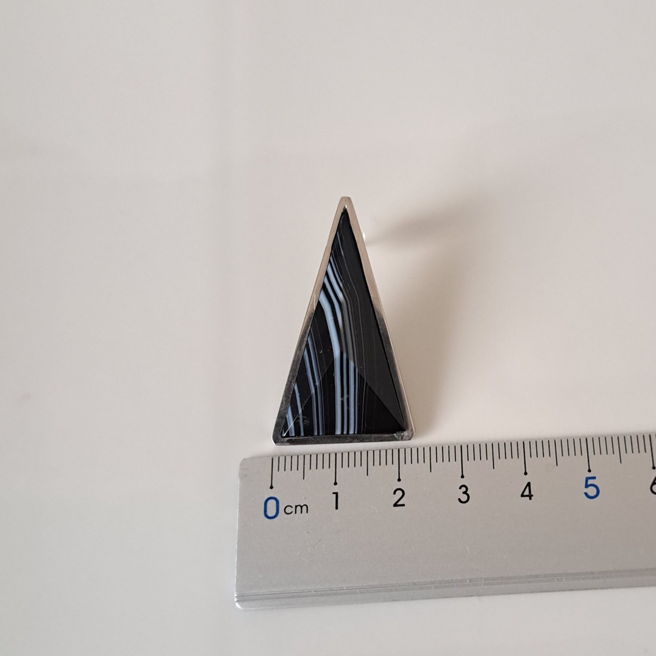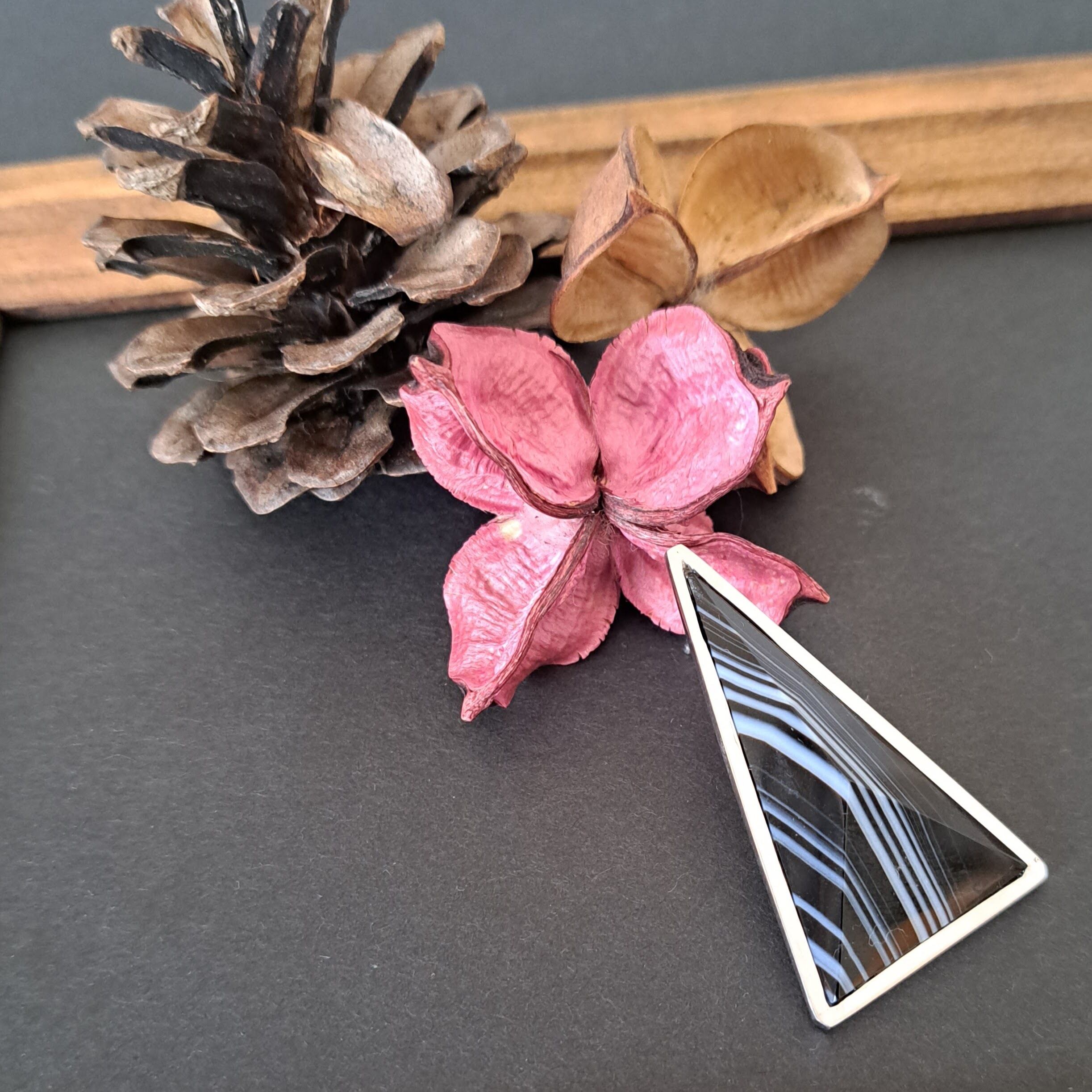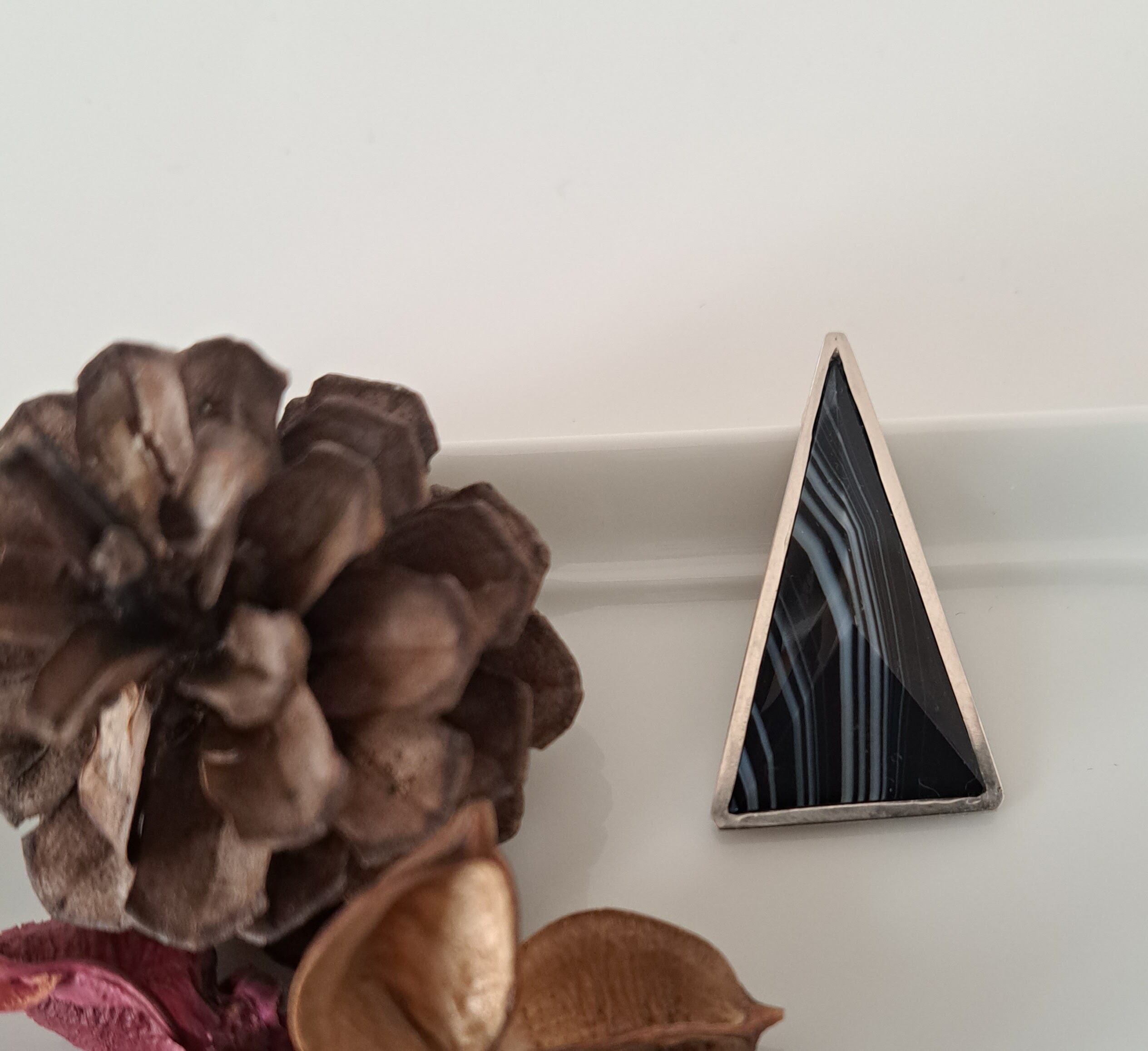 トライアングルの形をしたシックな天然石「シマオニキス」を使用した、大振りの片耳用ピアスが耳元で存在感を放つ一点もののジュエリーです。この神秘的な形状は、過去と未来、現実と夢の境界を曖昧にし、想像力をかき立てます。トライアングルの無限の解釈が、存在感とともに永遠に続いていく様子を彷彿とさせる、ユニセックスでお使いいただけるピアスです。